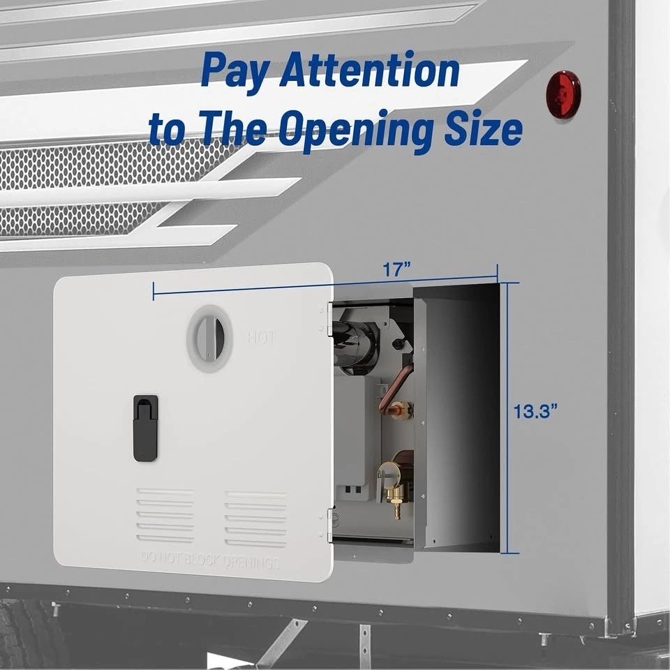 Basic: 15" x 18" white access door designed for Ranein RV water heaters, includes installation instructions for easy setup. Applicability If you are replacing your Atwood 6 gallon water heater with a Ranein RV water heater, please use this product for installation. Easy Installation The flush mount door fits snugly against the sidewall, providing a neater appearance and reducing the risk of leaks. Durable Made of galvanized steel, the door is both durable and sturdy. It is professionally designed to be waterproof and to prevent mosquitoes from entering your water heater. Anti-Bump The doors are equipped with sturdy hinges to withstand the bumps of the journey.