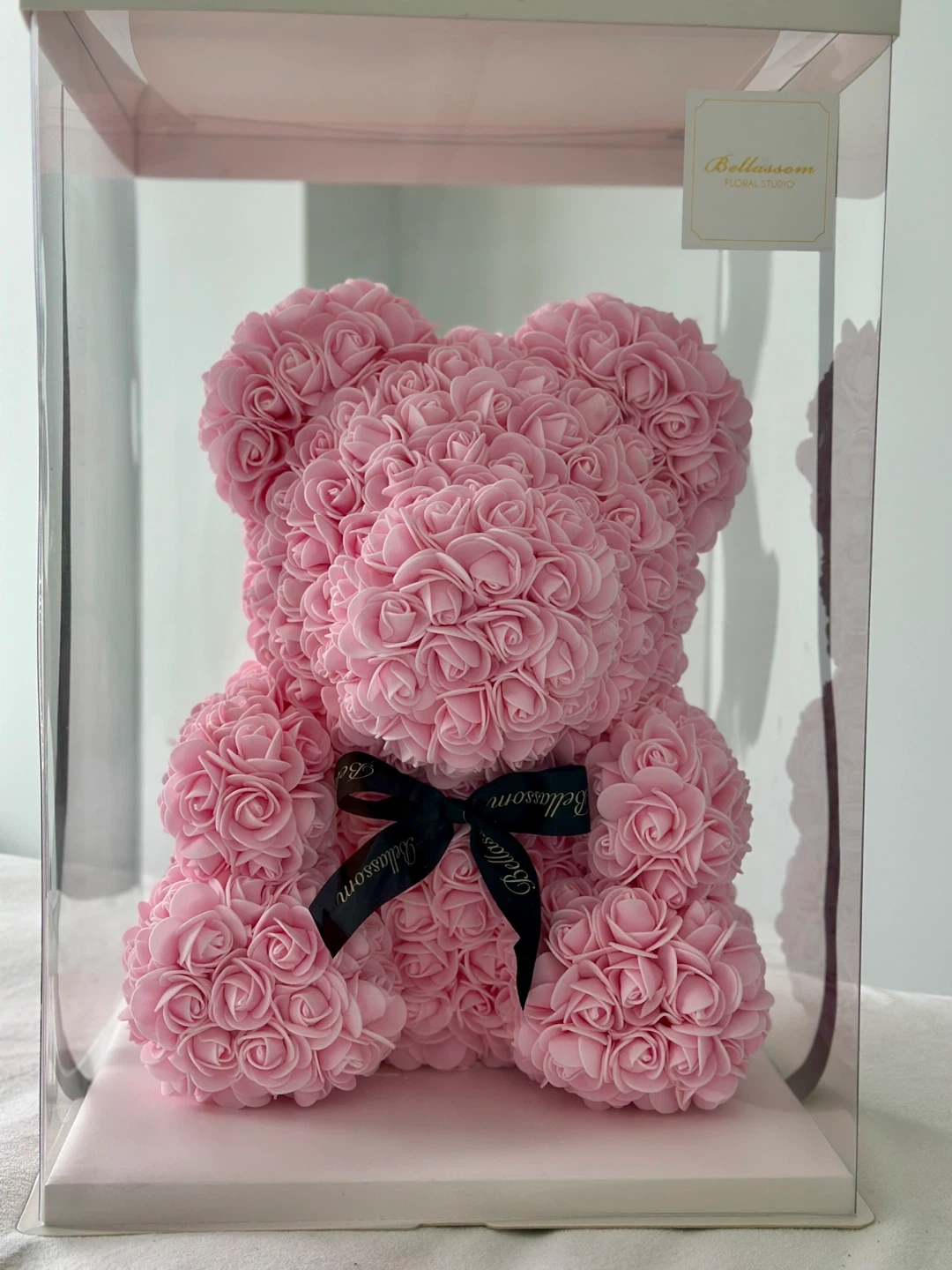 Selling a beautiful Bellassom 35cm x 25cm rose bear! It's in lovely pink colour and comes in its original box. This adorable bear is made of artificial roses and makes a perfect gift or a charming addition to any room!