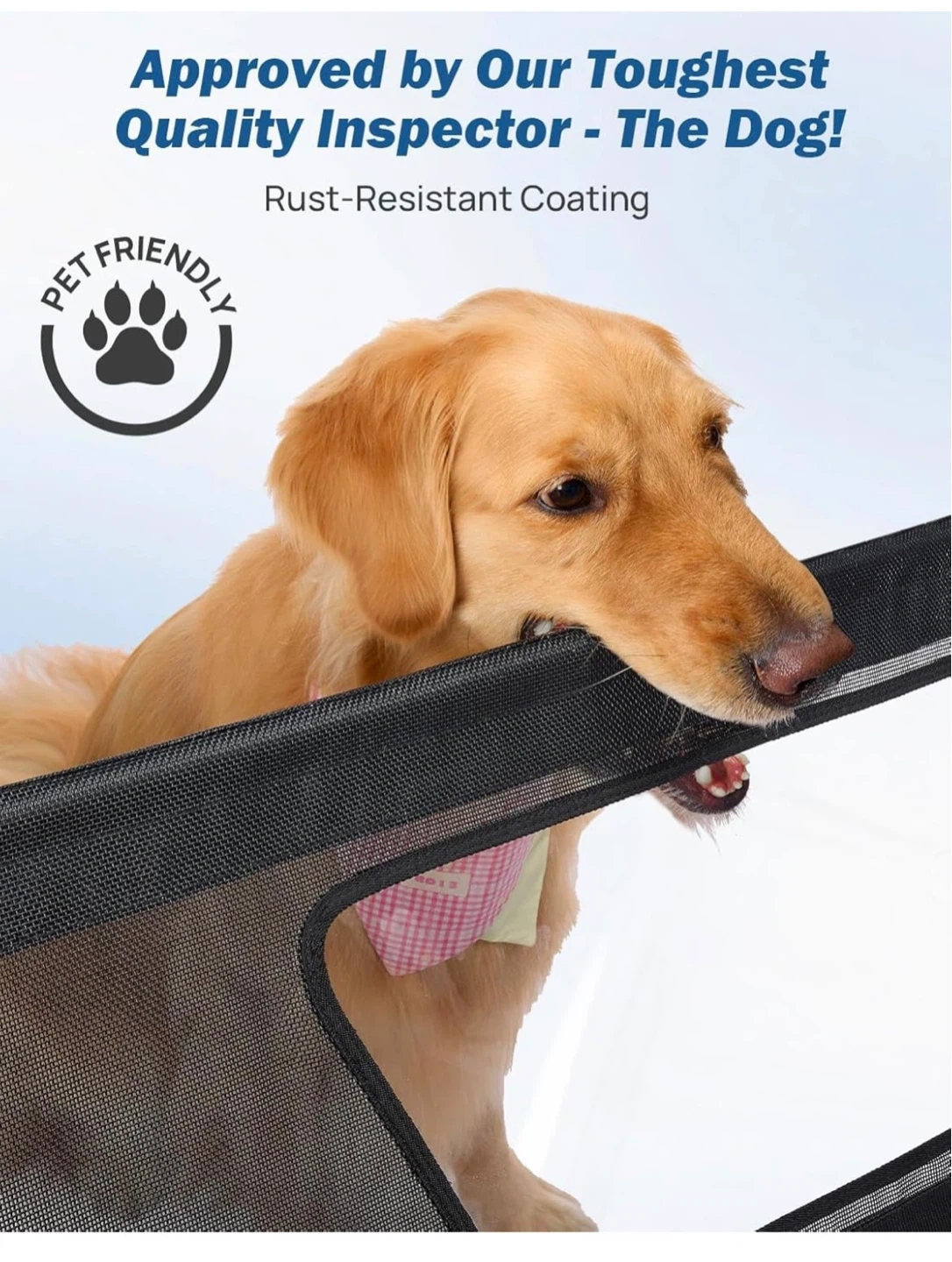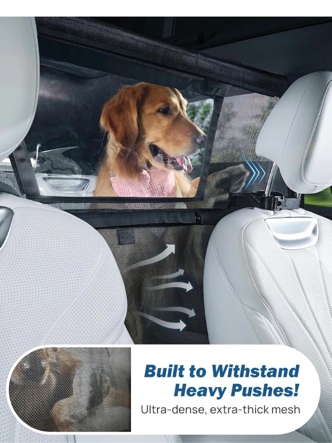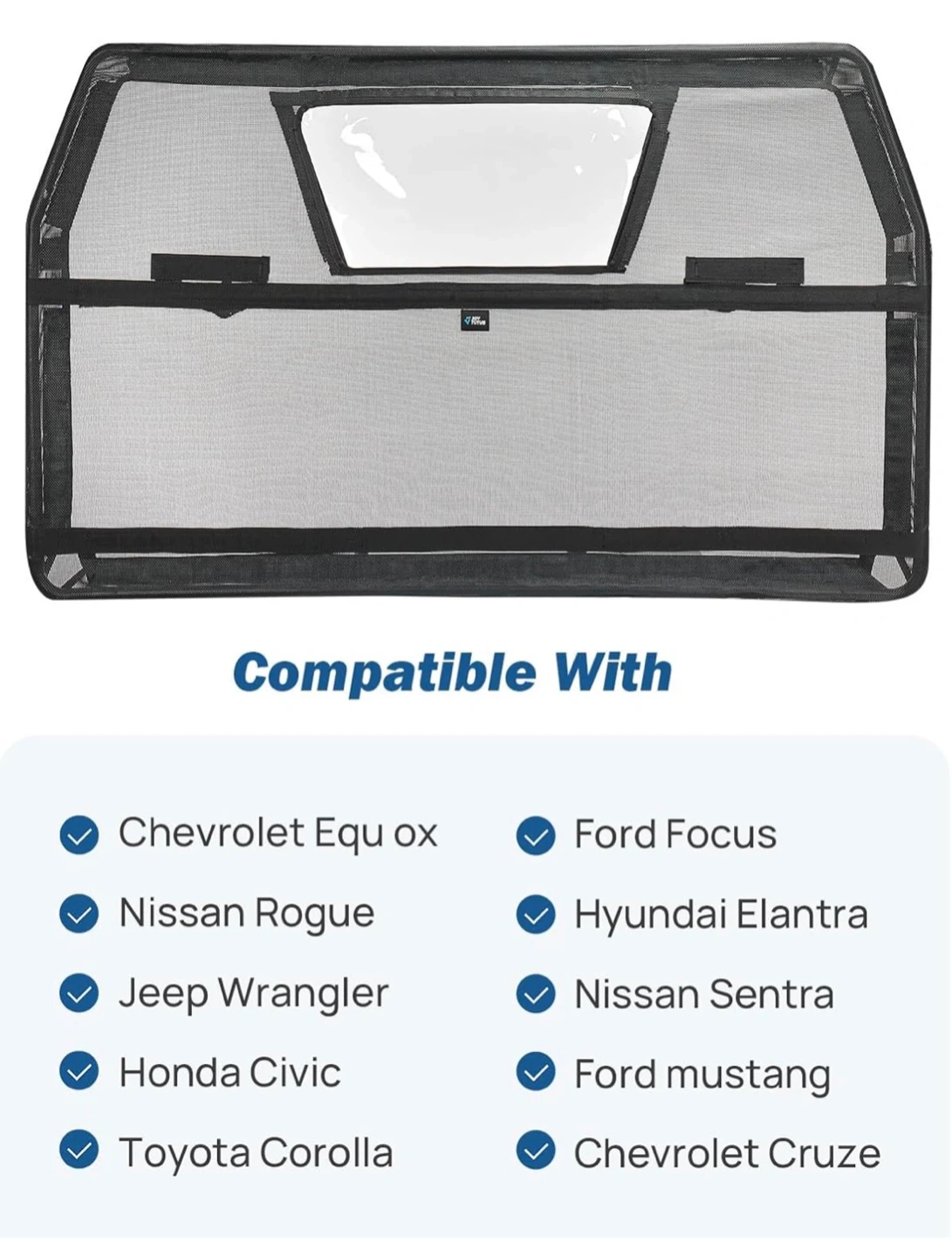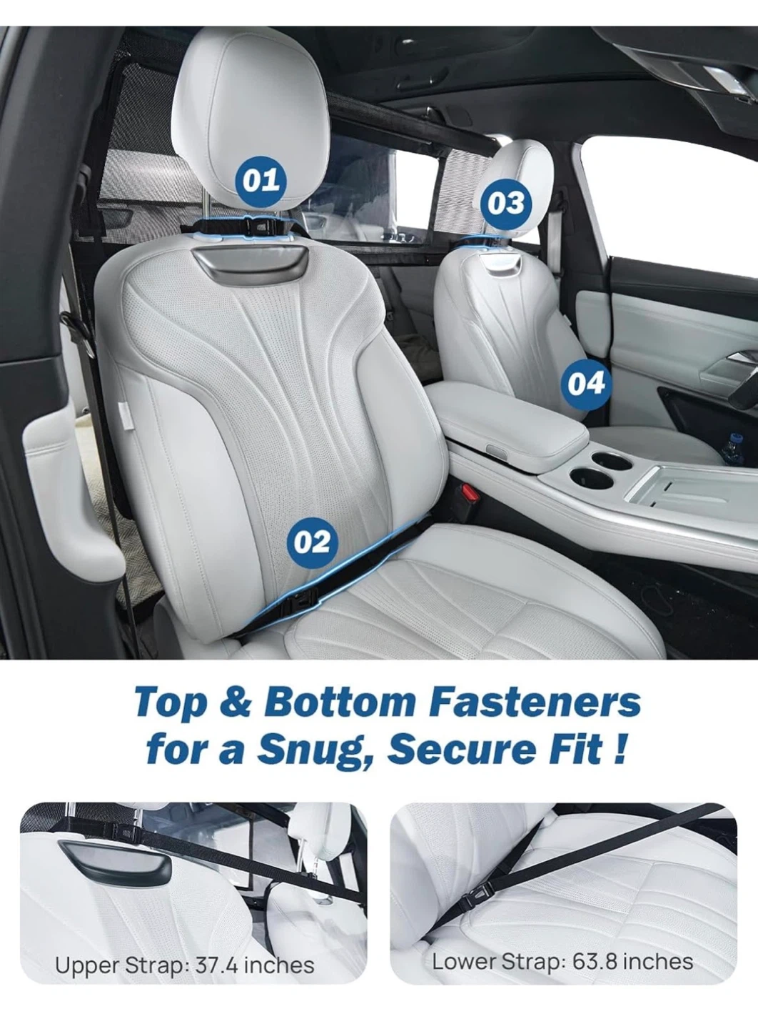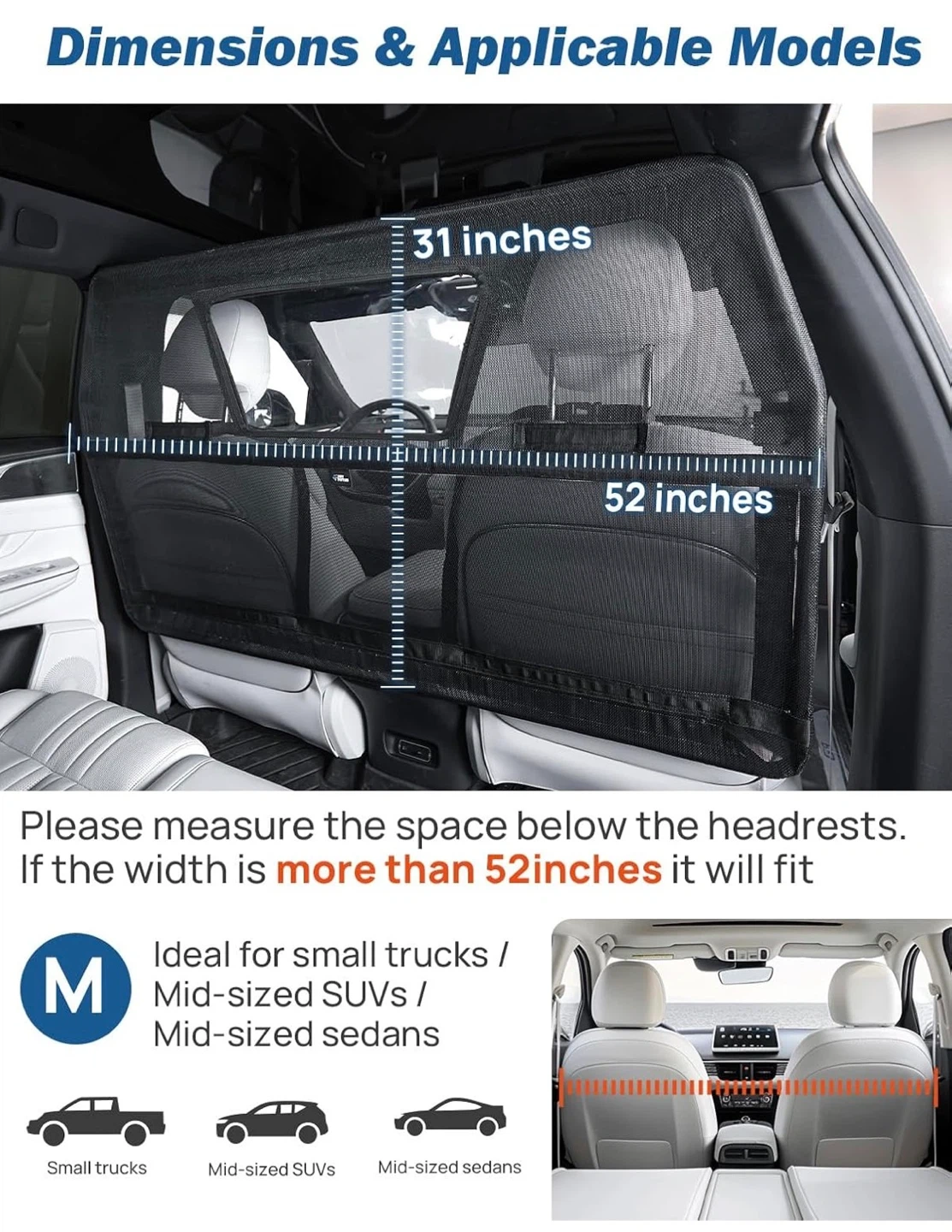 Keep your furry friend safe and secure in the car with this pet barrier! It's designed to fit in most small trucks, mid-sized SUVs, and mid-sized sedans. The barrier is 52 inches wide and 31 inches tall, providing ample coverage. It's made with ultra-dense, extra-thick mesh to withstand heavy pushes and has a rust-resistant coating. It also features top and bottom fasteners for a snug and secure fit!