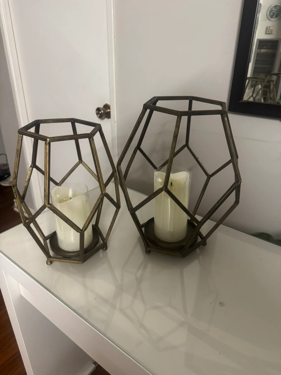 Selling a set of two metal geometric candle holders. They have an antique gold colour and are in good condition. Perfect for adding a touch of modern style to your home decor! With two flickering candles included.
