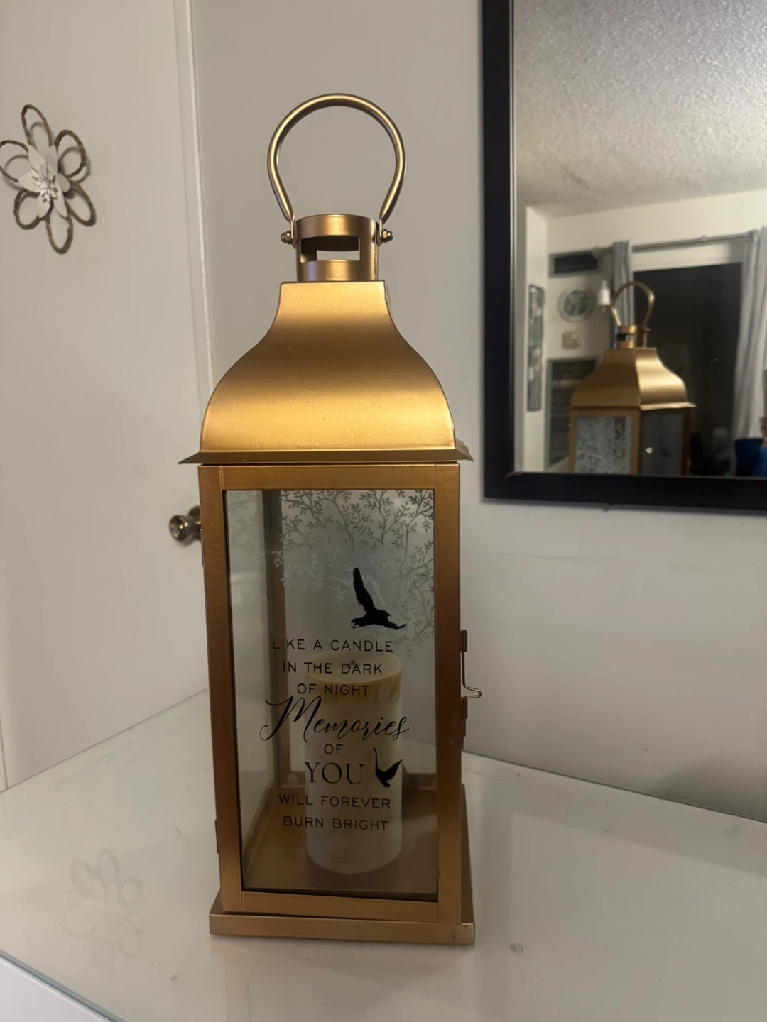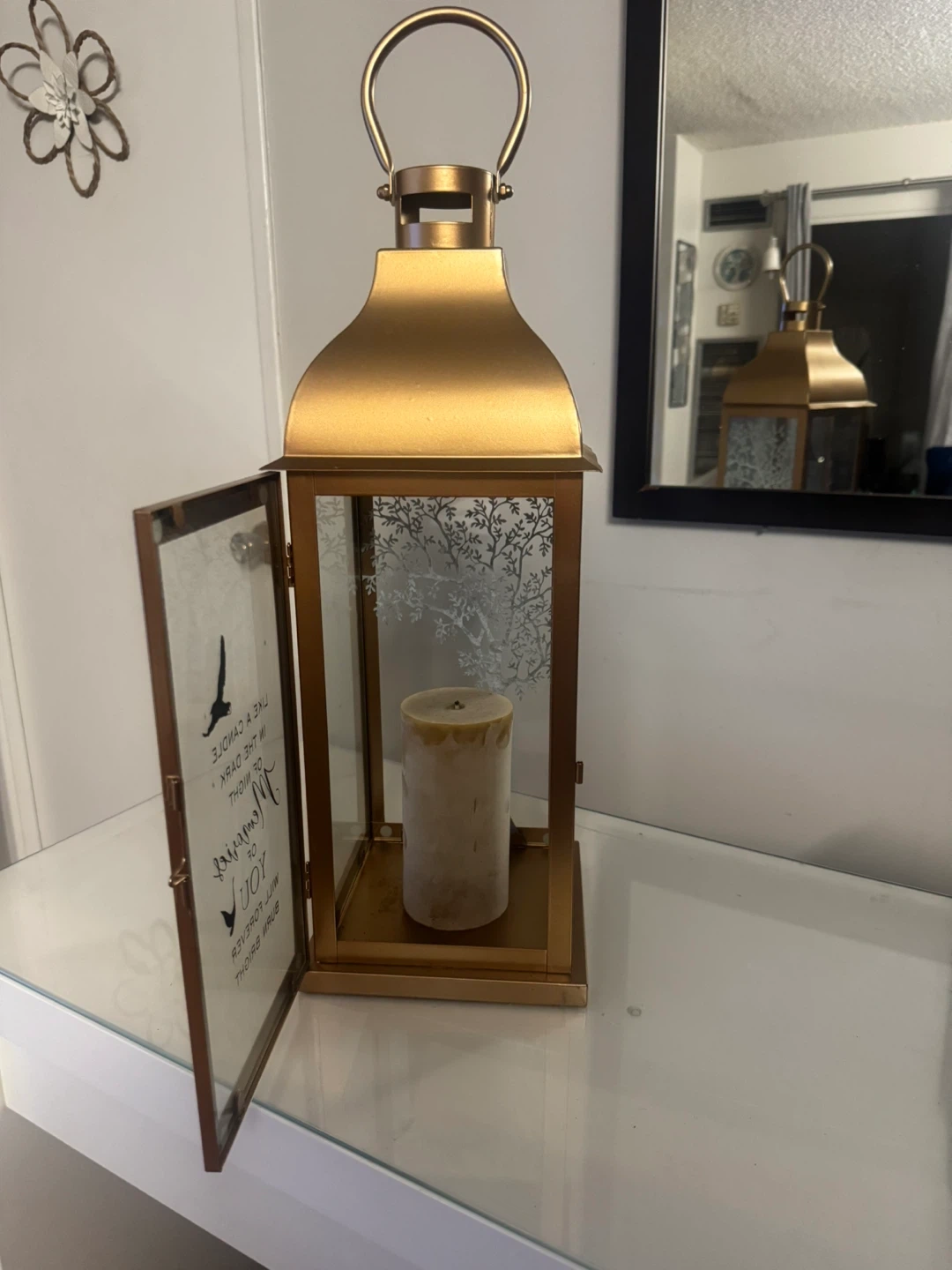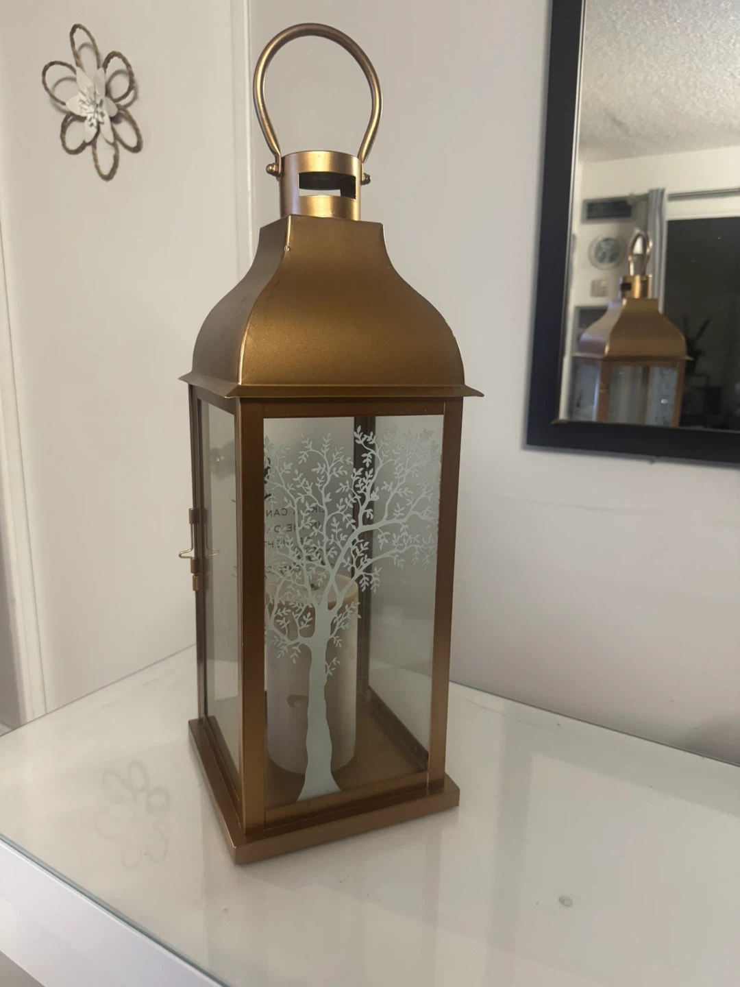 This is a beautiful heavy gold metal candle lantern that will add a touch of warmth to any room. It features glass panels with decorative designs, including a tree and a lovely saying. Perfect for creating a cozy atmosphere in your home!