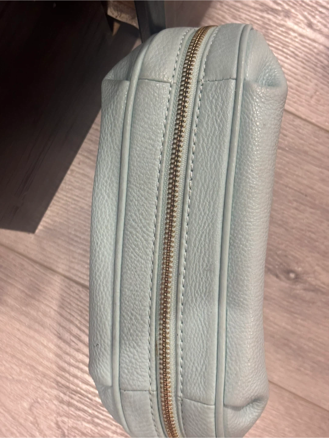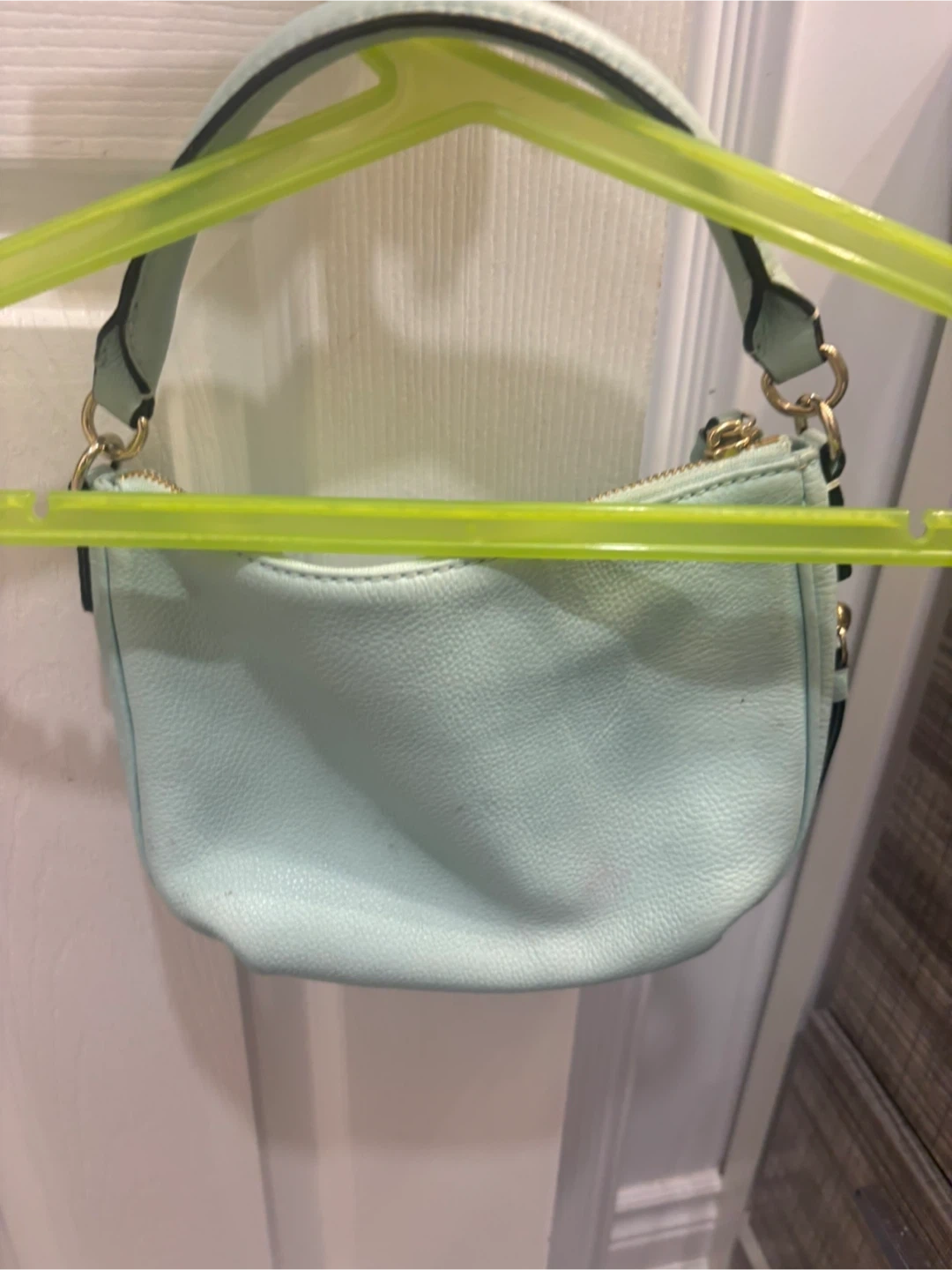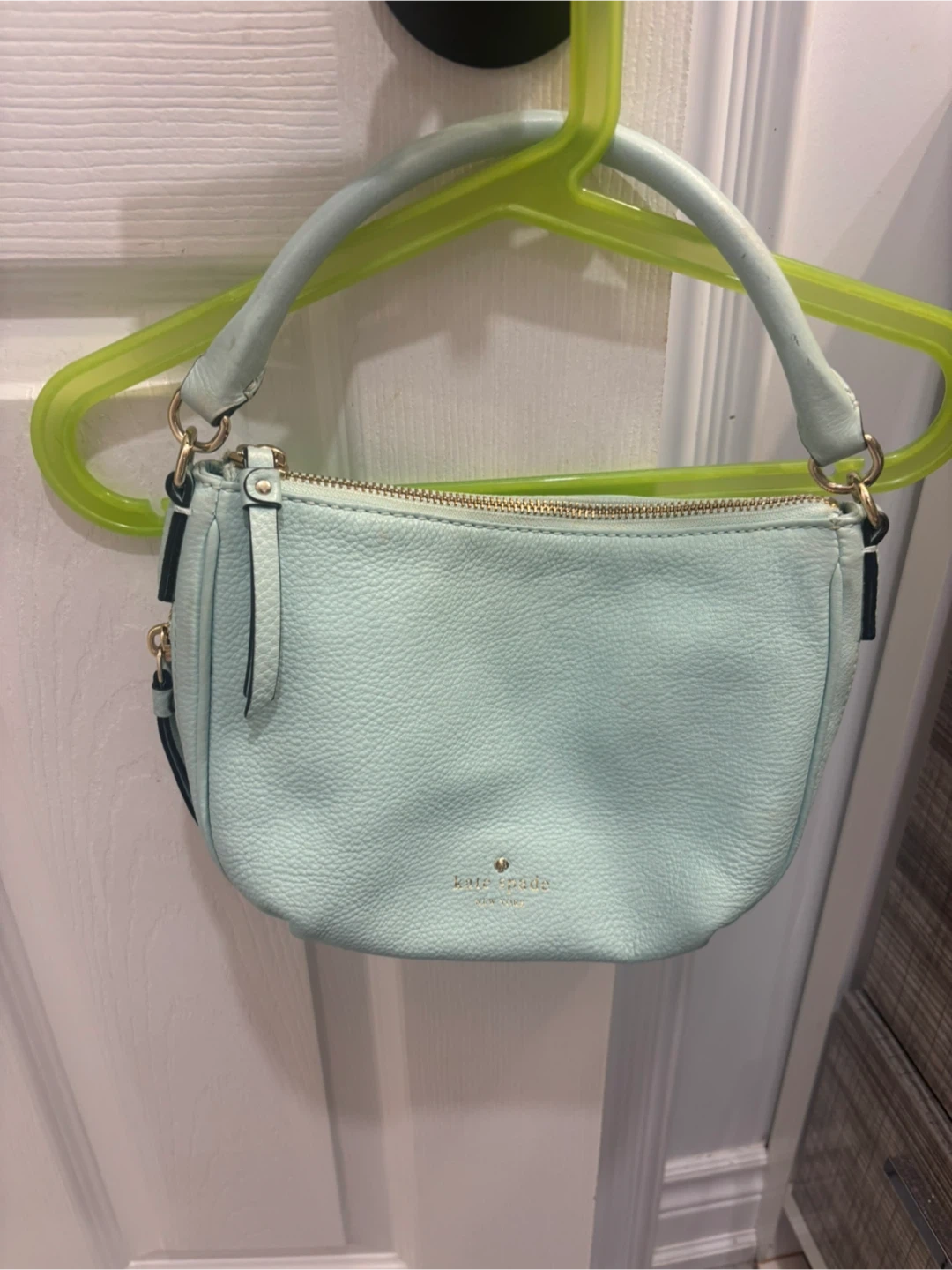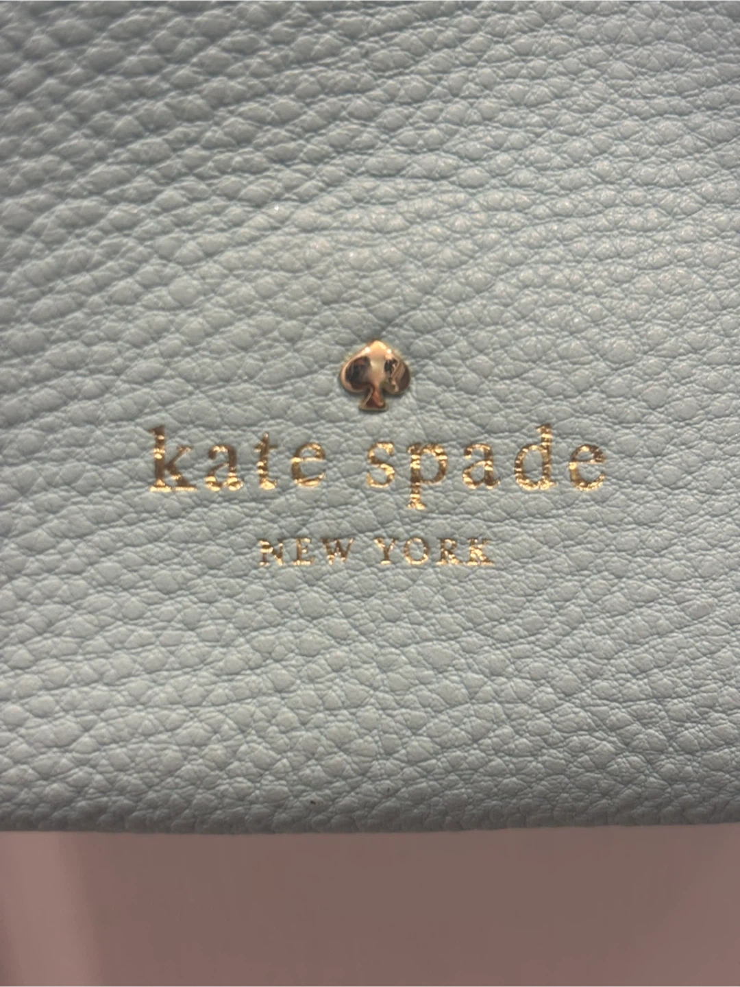 This is a cute Kate Spade New York handbag in a light blue colour. The interior lining is black and white striped.