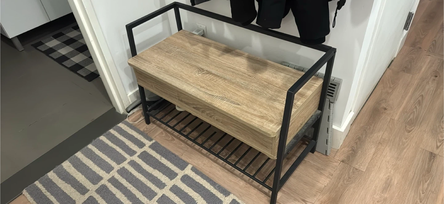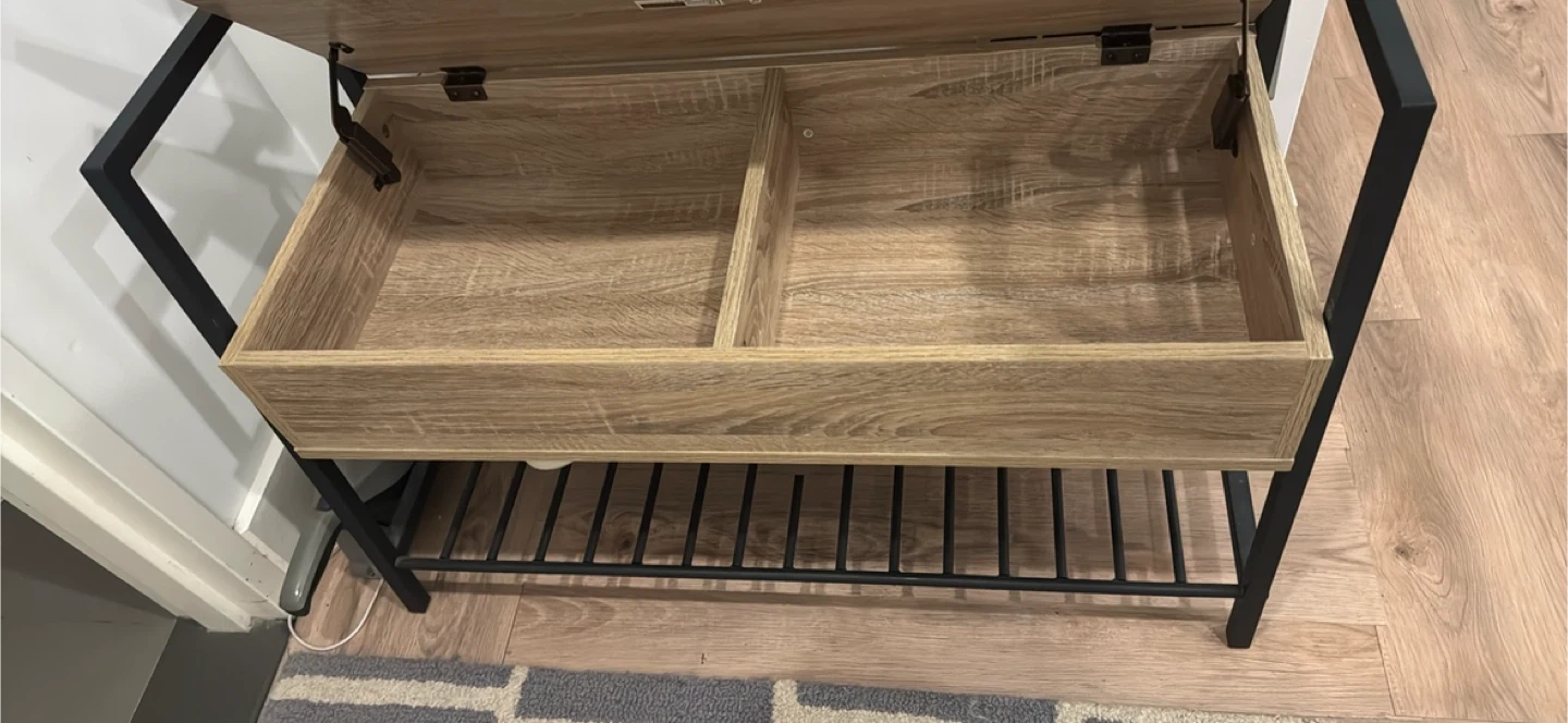 I'm selling an entryway bench with storage! It's perfect for keeping shoes and other items organized near the door. The bench features a wooden top that lifts up to reveal two storage compartments. There's also a lower shelf for additional storage or display! The frame is made of sturdy black metal.