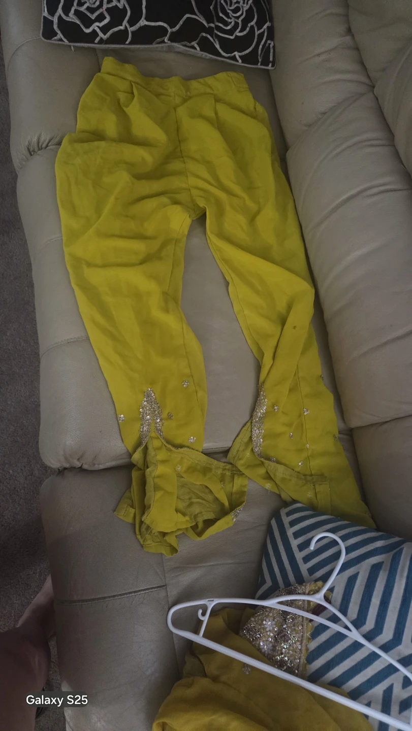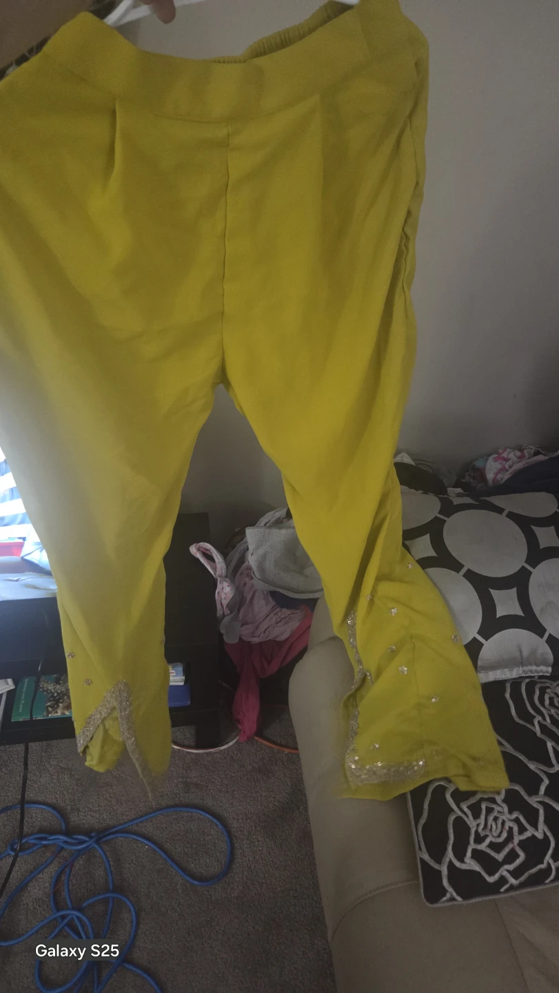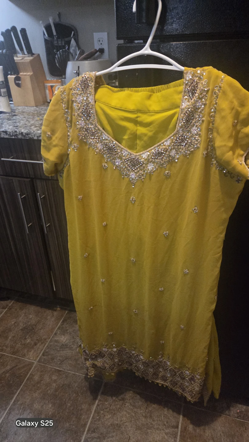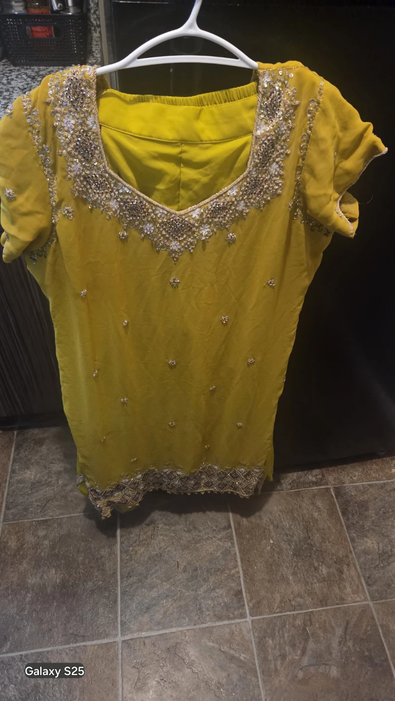 Selling a beautiful yellow Salwar Kameez suit. It features intricate detailing and is perfect for special occasions. It is in good condition and ready for a new owner!