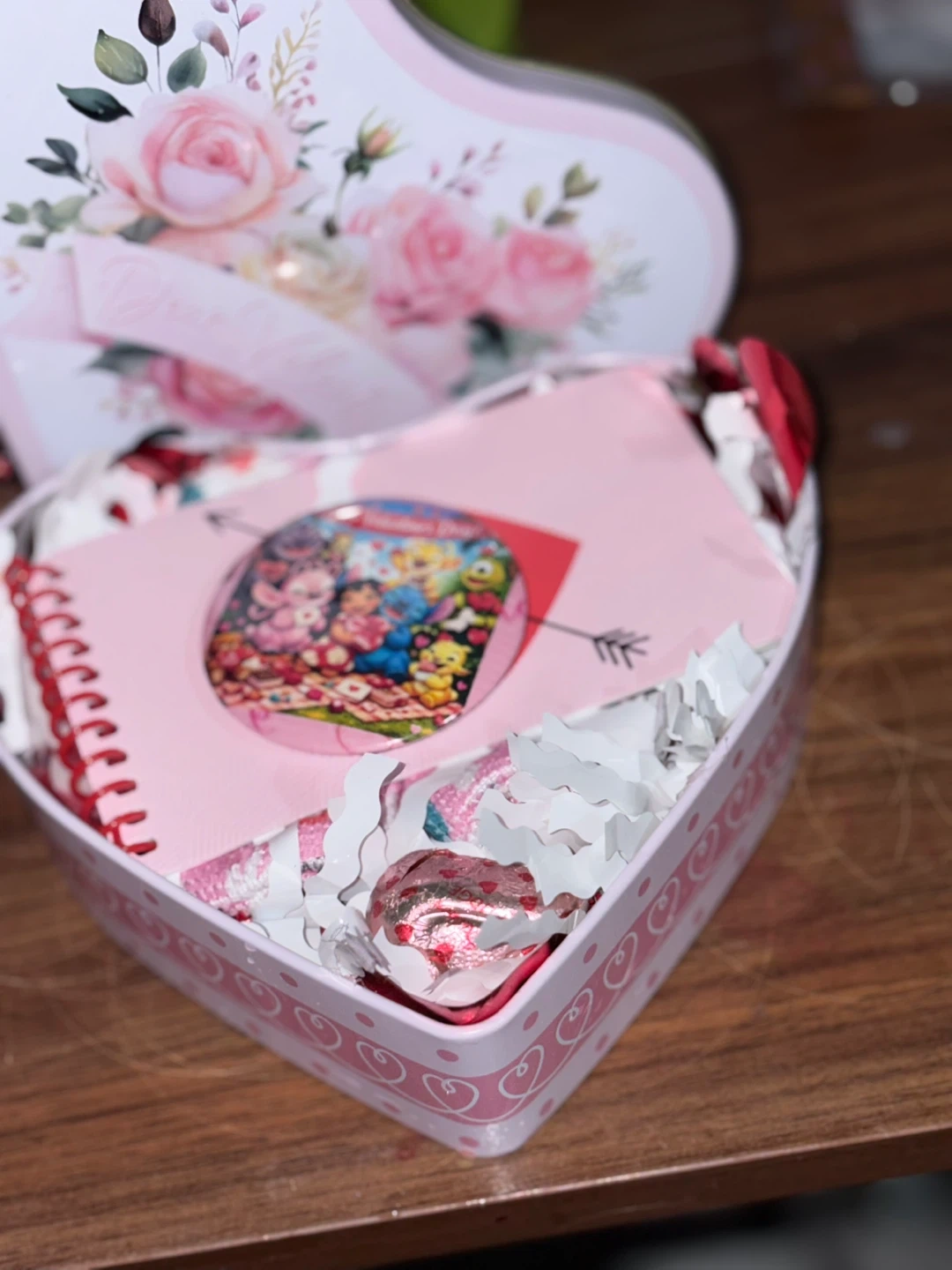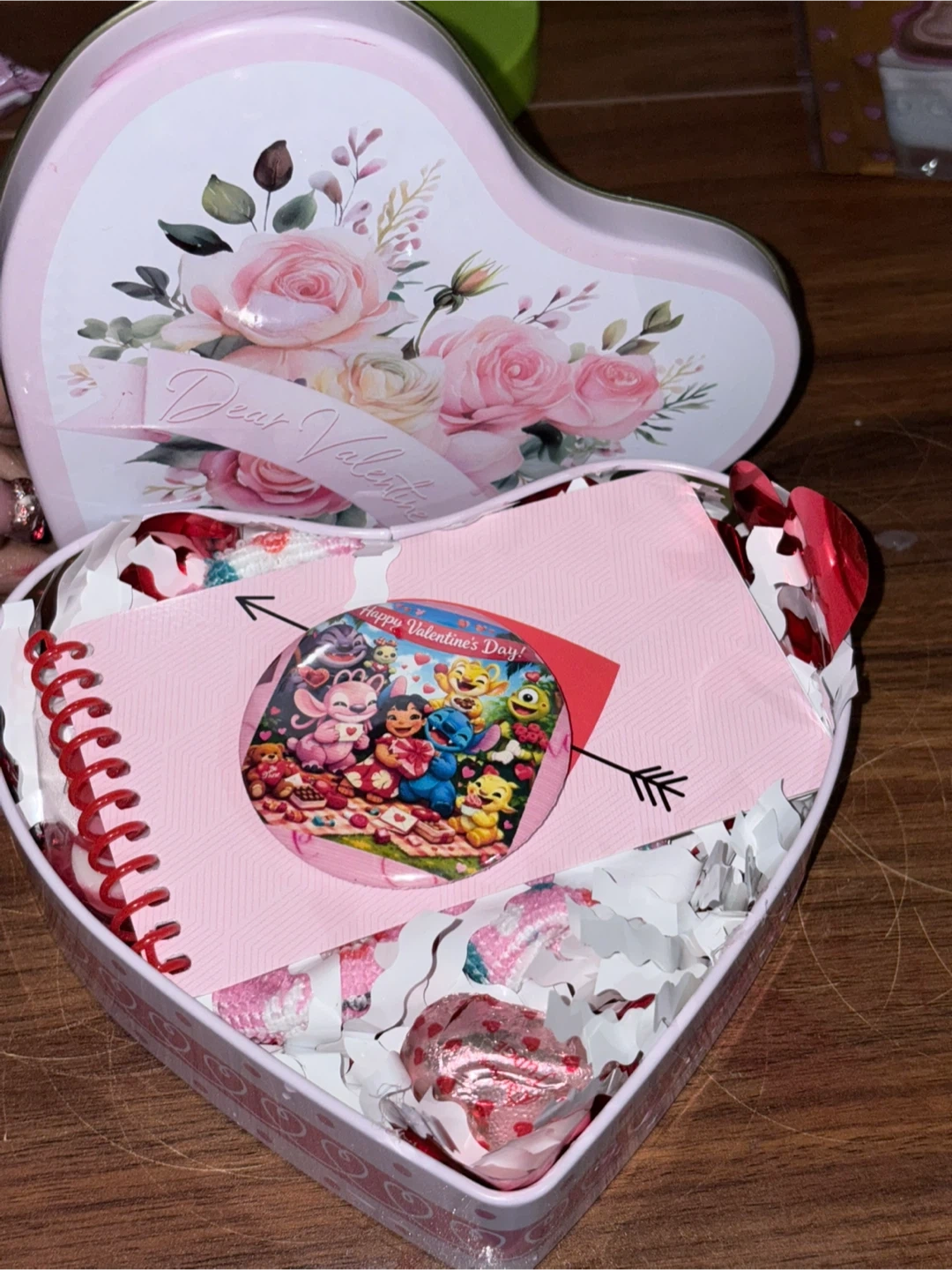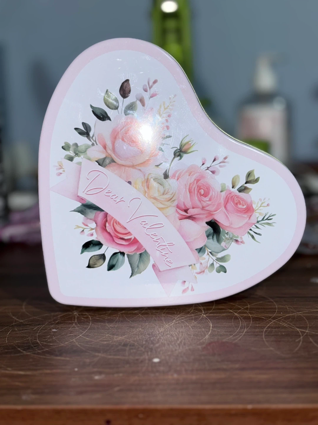 Cute heart shaped tin with a floral design and "Dear Valentine" banner. It's perfect for storing small trinkets or gifting treats!