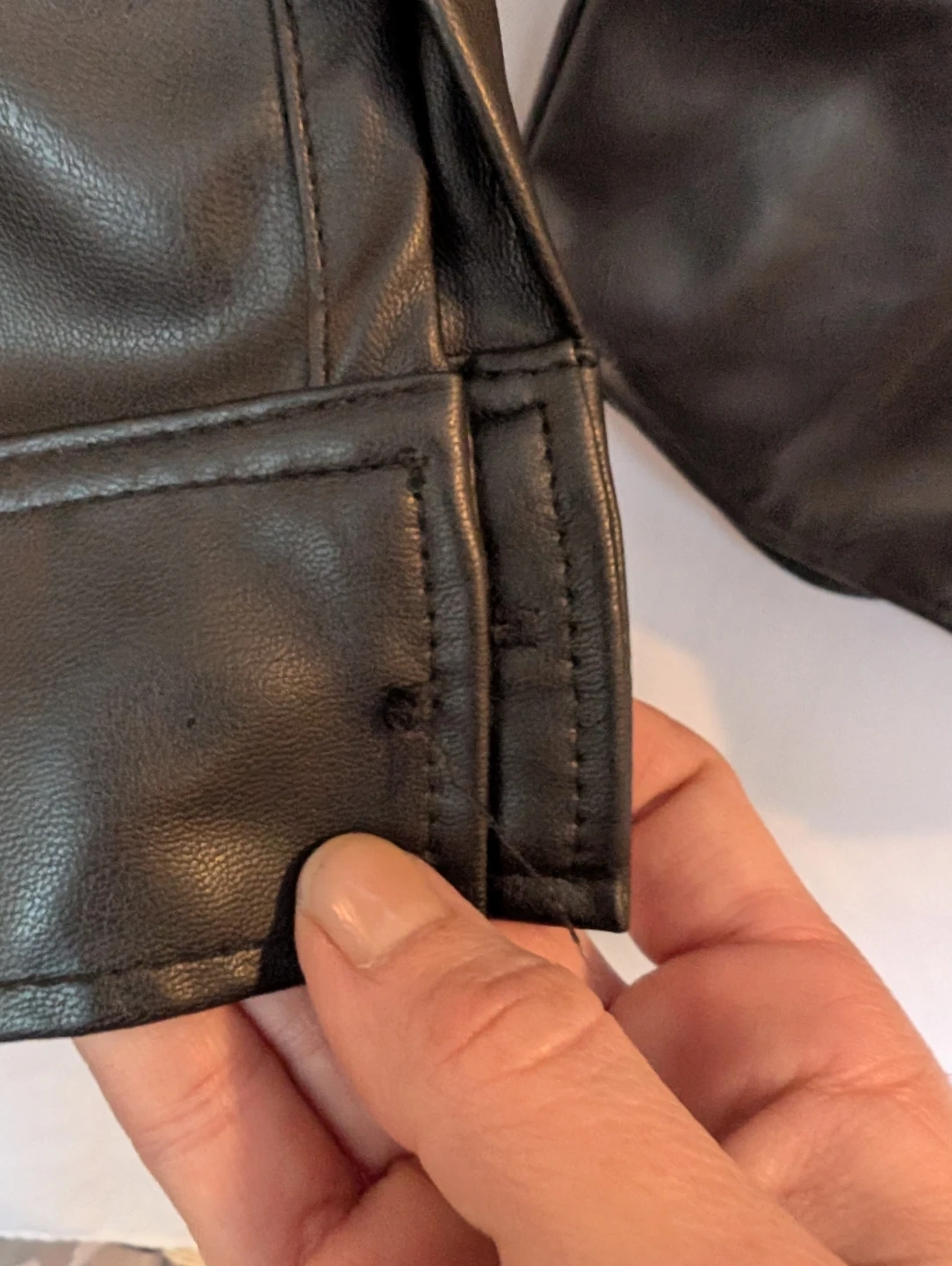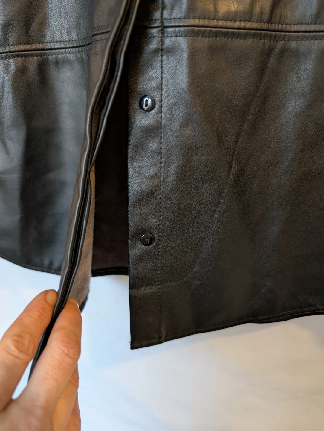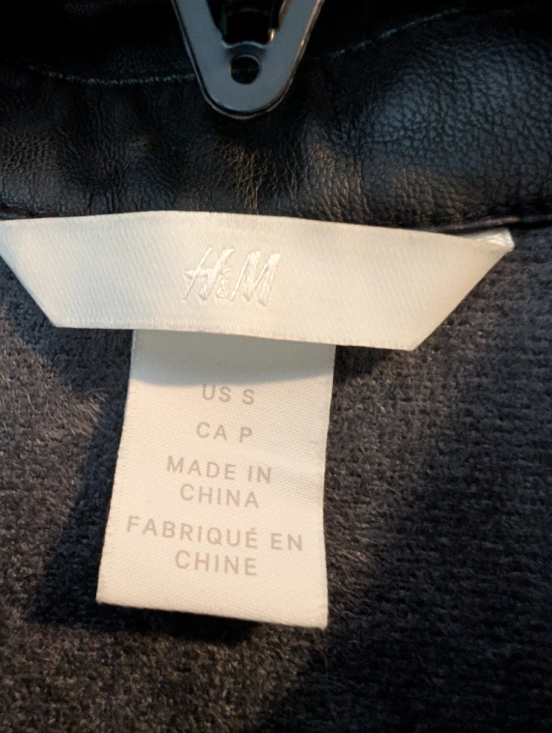 Selling a black faux leather shirt from H&M in size small. Relaxed fit. It's in perfect condition except a missing button on one cuff as shown in the pictures. Luckily, it has a replacement button attached to the tag.