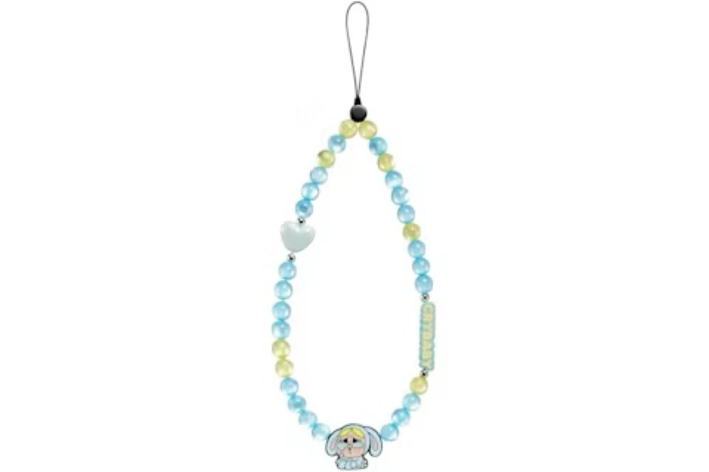 Add some charm to your phone with this cute beaded phone strap! It features a mix of blue and yellow beads, a heart accent, and a Crybaby character charm