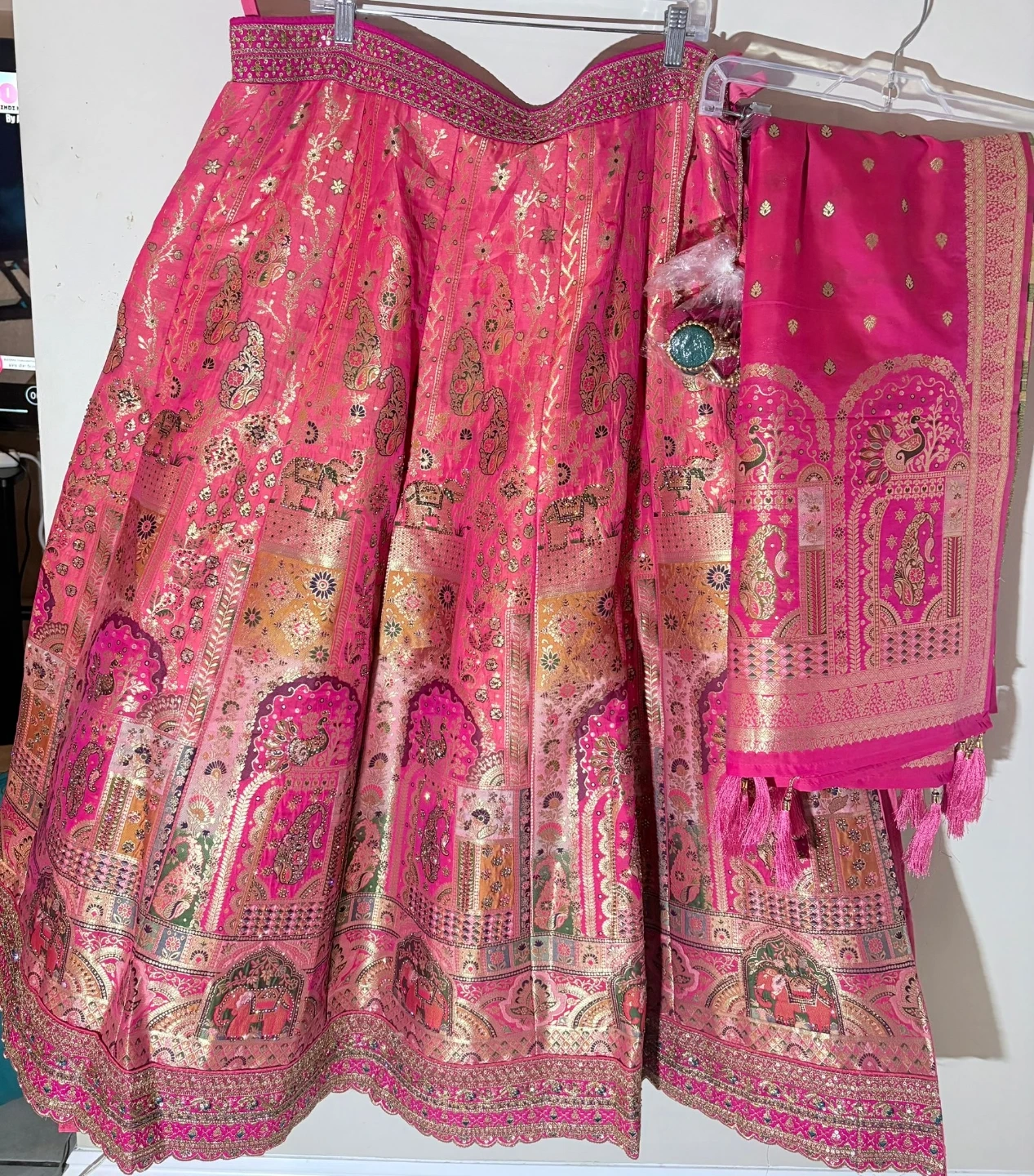 Beautiful pink lehenga choli with dupatta, perfect for a special occasion! The intricate gold detailing adds a touch of elegance. It is new and in trend.