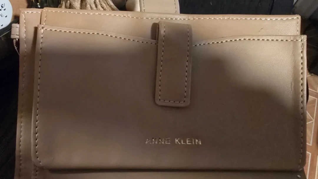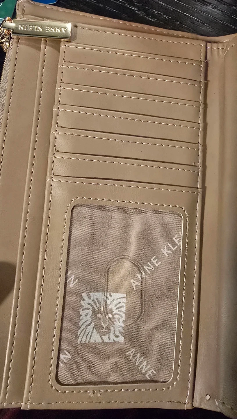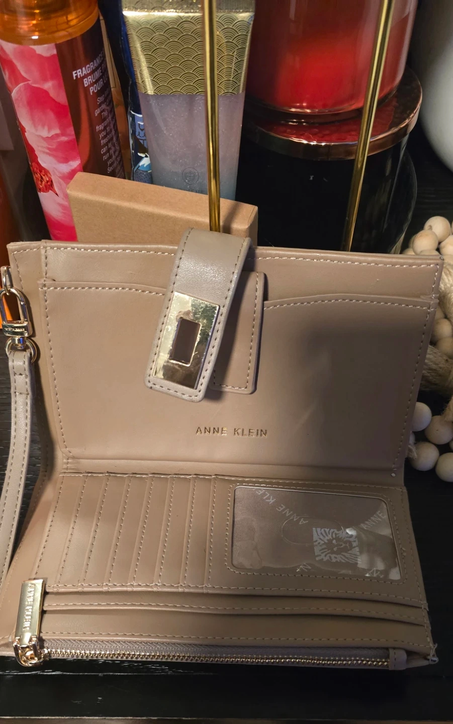 🥕Selling a beige AK Anne Klein wristlet wallet. It features a gold-tone accent on the front flap. Many slots for cards and various compartments, It's in like new condition and ready for a new owner!