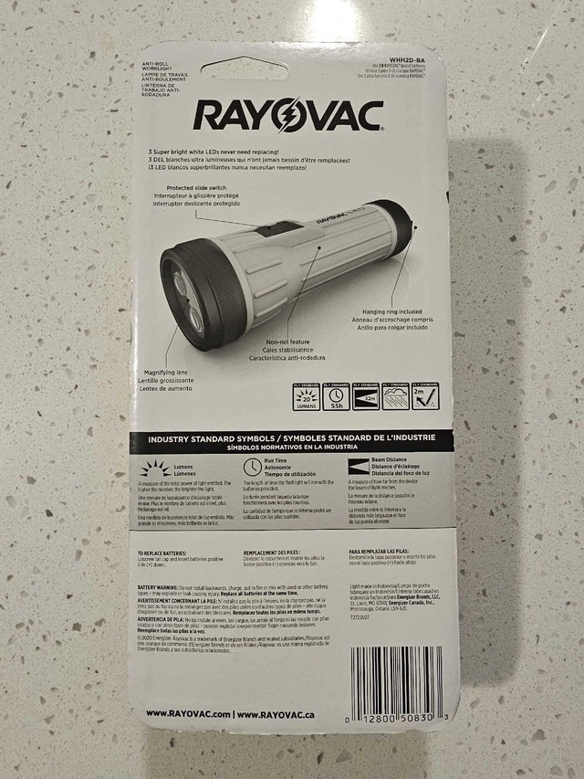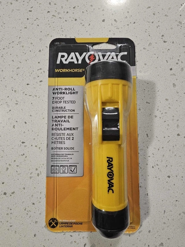 I'm selling a brand new Rayovac Workhorse flashlight, still in its original packaging. This durable LED worklight is drop-tested and designed with an anti-roll feature, making it perfect for any job. Its bright and long-lasting beam ensures visibility in any situation.