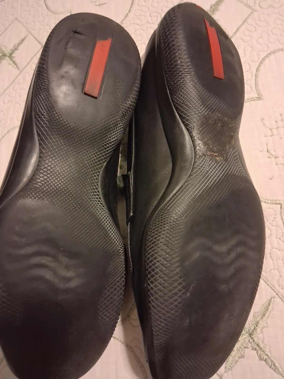 Selling a pair of Prada black leather loafers. They show some signs of wear, as you can see in the photos. Still have a lot of life left in them!
