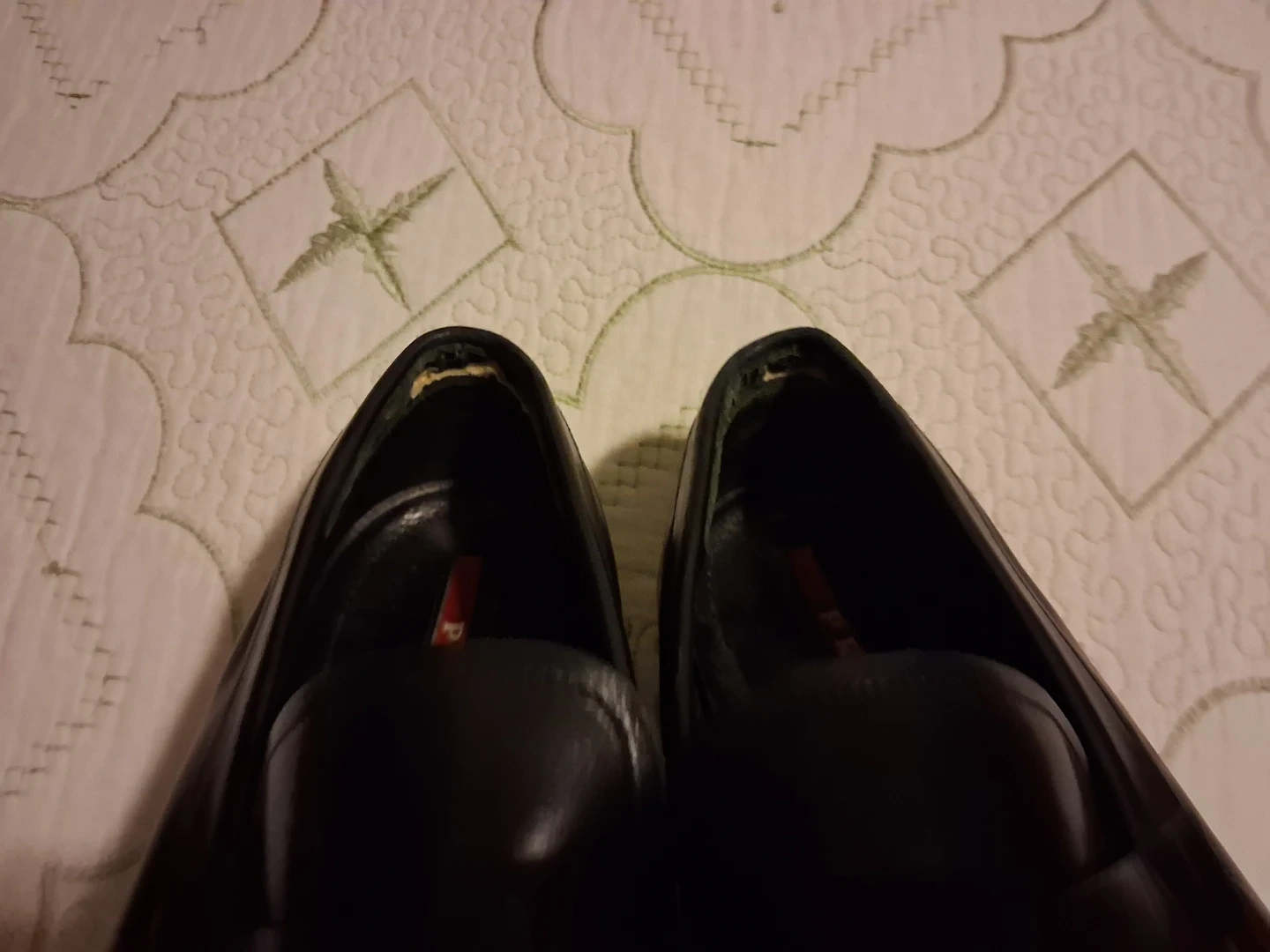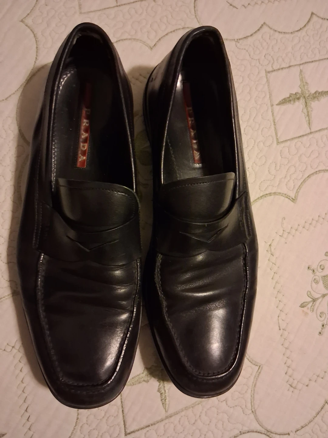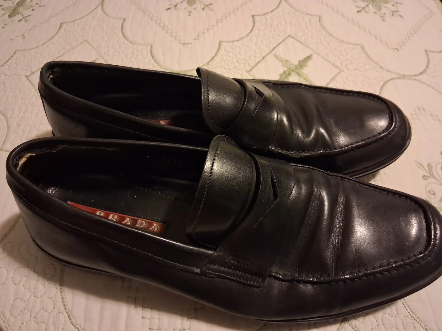 Selling a pair of Prada black leather loafers. They show some signs of wear, as you can see in the photos. Still have a lot of life left in them!