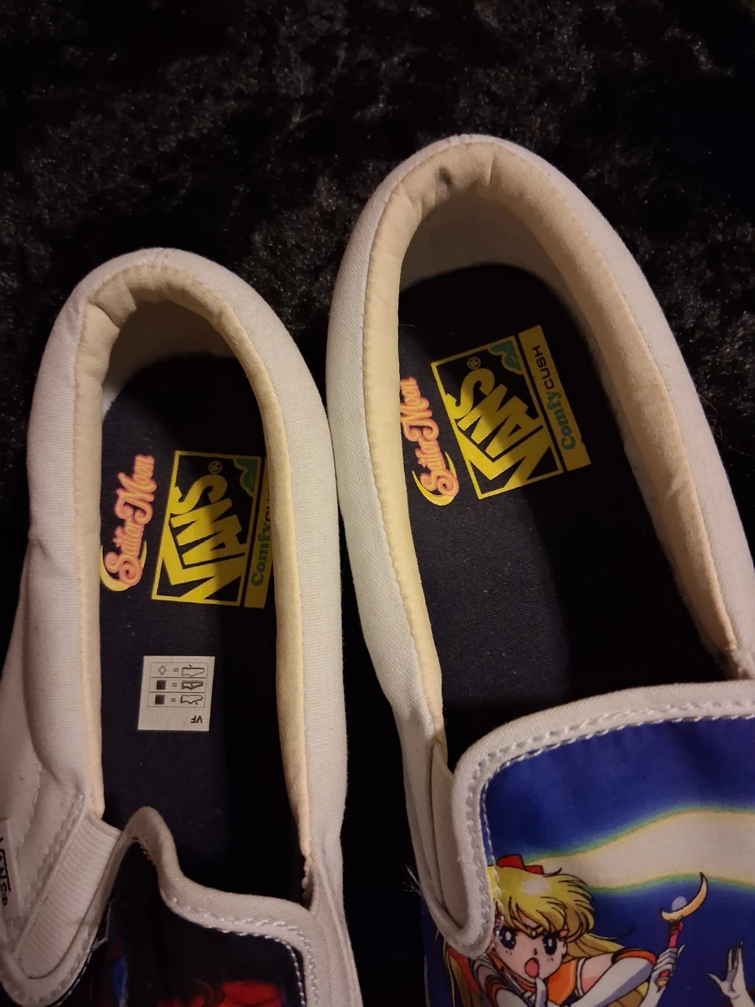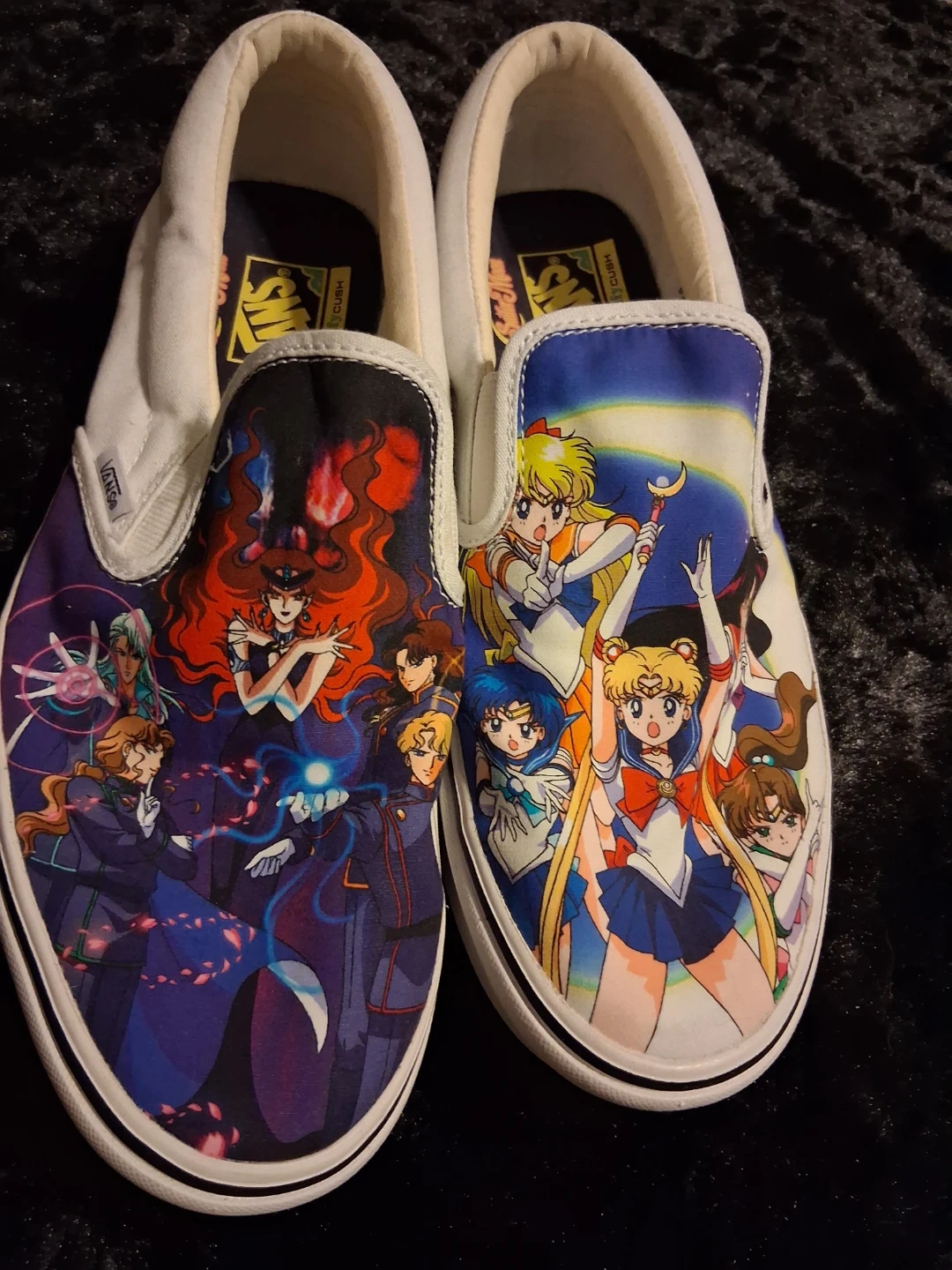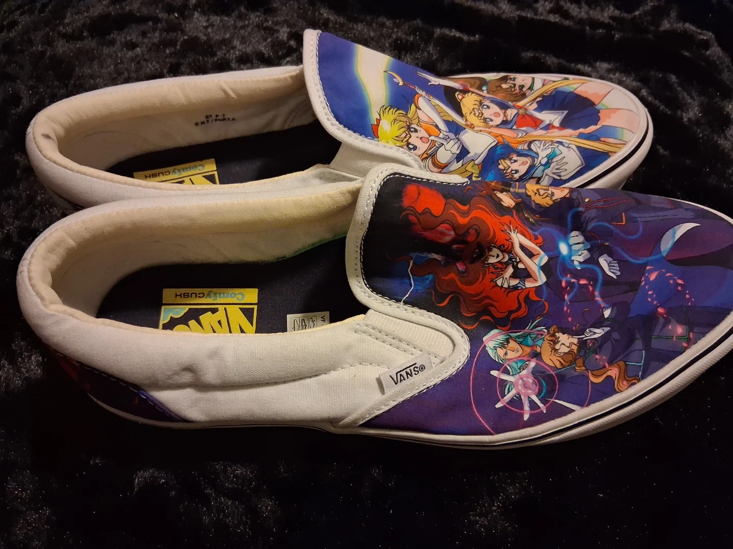 Selling a pair of Vans x Sailor Moon ComfyCush slip-on shoes! These shoes feature a unique design with Sailor Moon characters. They are in great condition and ready for a new owner!