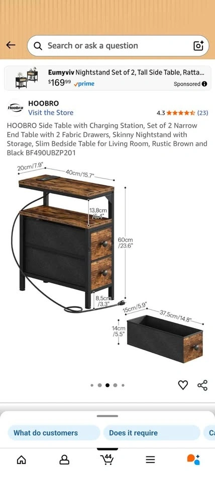 HOOBRO Side Table with Charging Station, Set of 2 Narrow End Table with 2 Fabric Drawers, Skinny Nightstand with Storage, Slim Bedside Table for Living Room, Rustic Brown and Black BF490UBZP201