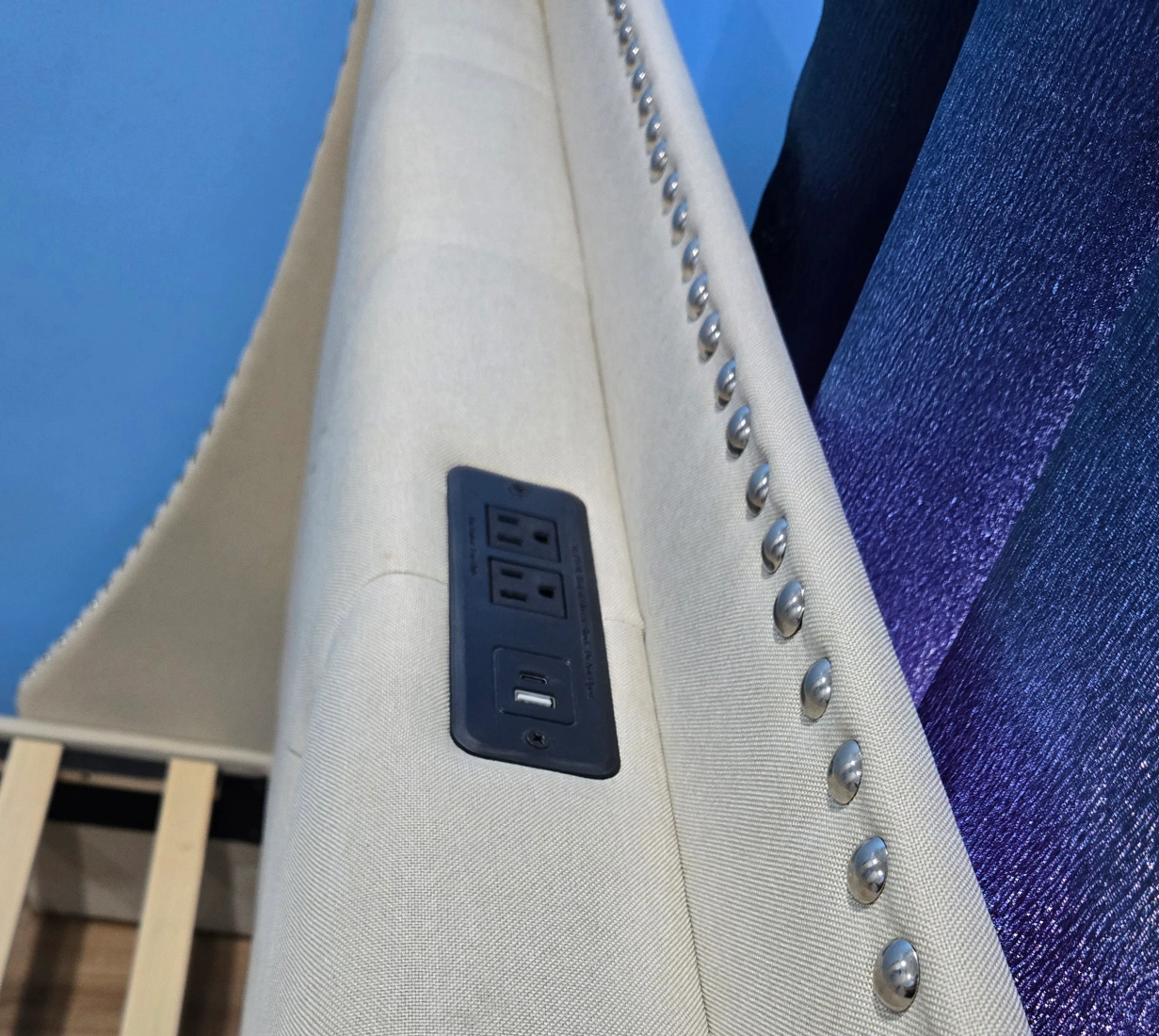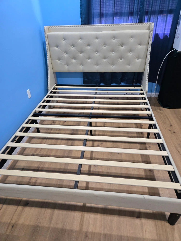 Selling a platform bed frame with an upholstered headboard. It features a light beige fabric with button tufting and silver nailhead trim. There are also built-in outlets and USB ports on the headboard. The bed frame is in good condition and ready for a new home