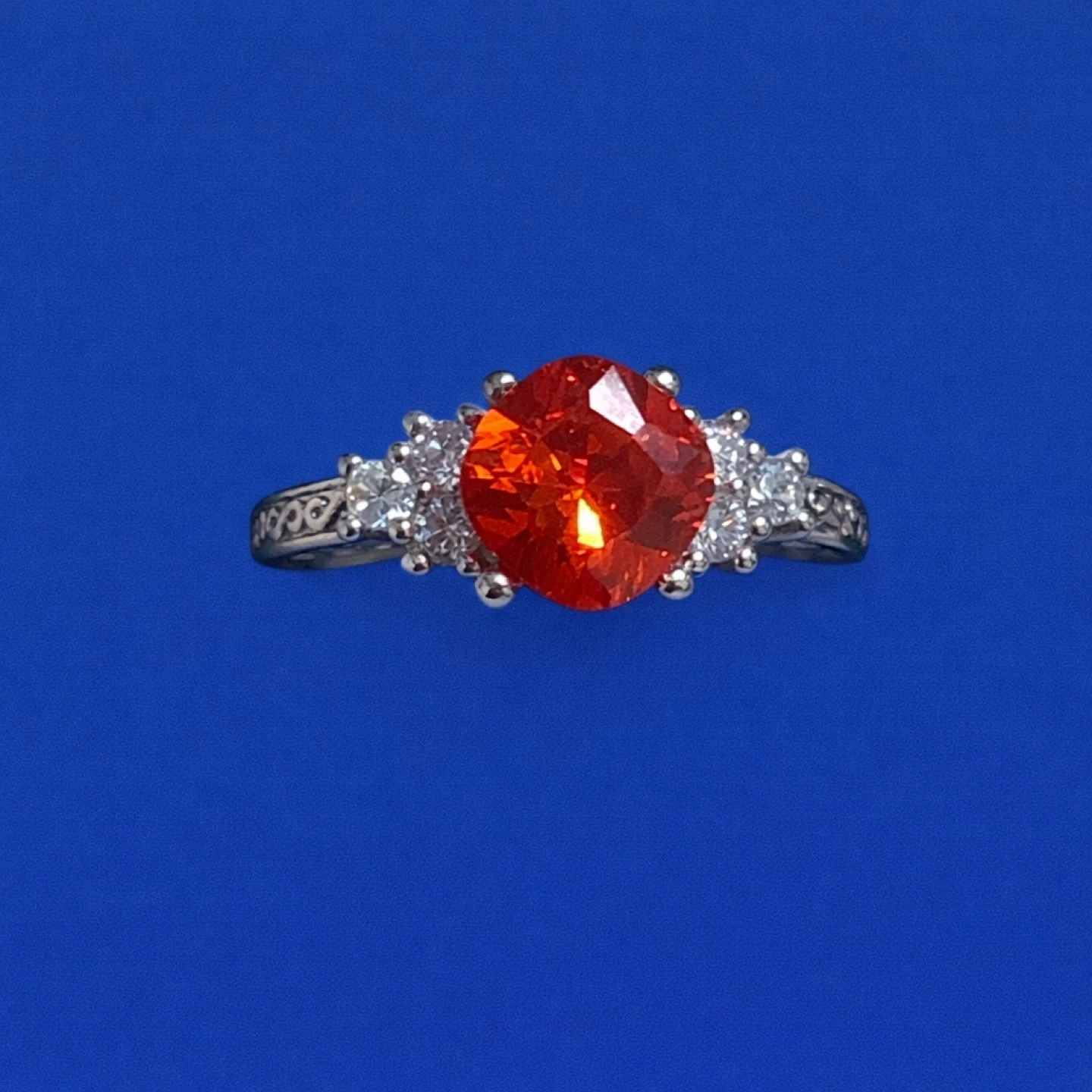 Elegant statement ring featuring a vivid oval-cut garnet, beautifully set in a classic sterling silver band with intricate filigree detailing. The center stone is flanked by sparkling diamond-style accent stones, adding brilliance and sophistication from every angle.