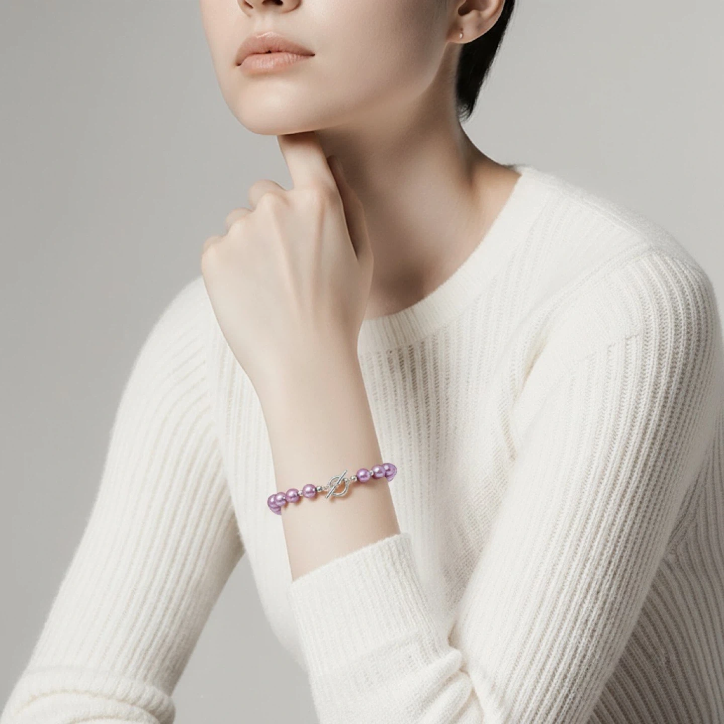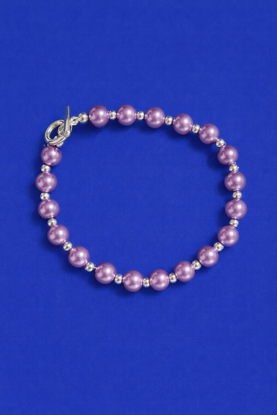 A pretty pearl bracelet in a lovely lilac colour! The pearls are round and separated by small silver beads. It has a toggle clasp for easy fastening. A nice accessory for any outfit!