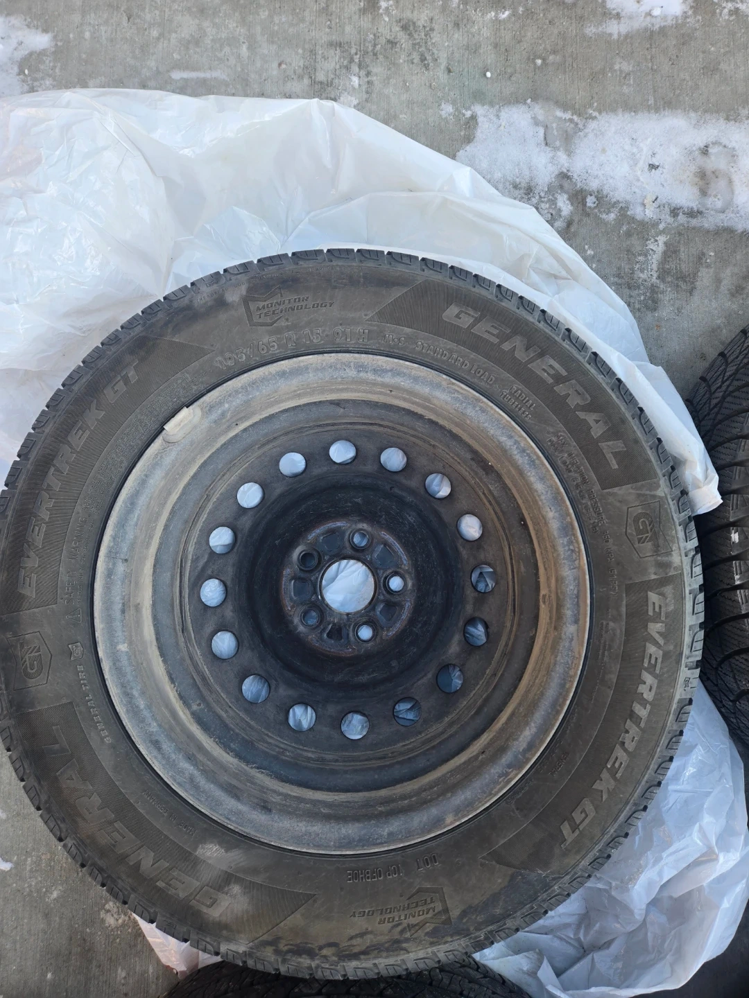 Comes with 3 GT Evertrek all Season Tires. Barely used for 8 months. 195/65 R15. The fourth tire is a flat so it will need to be replaced.