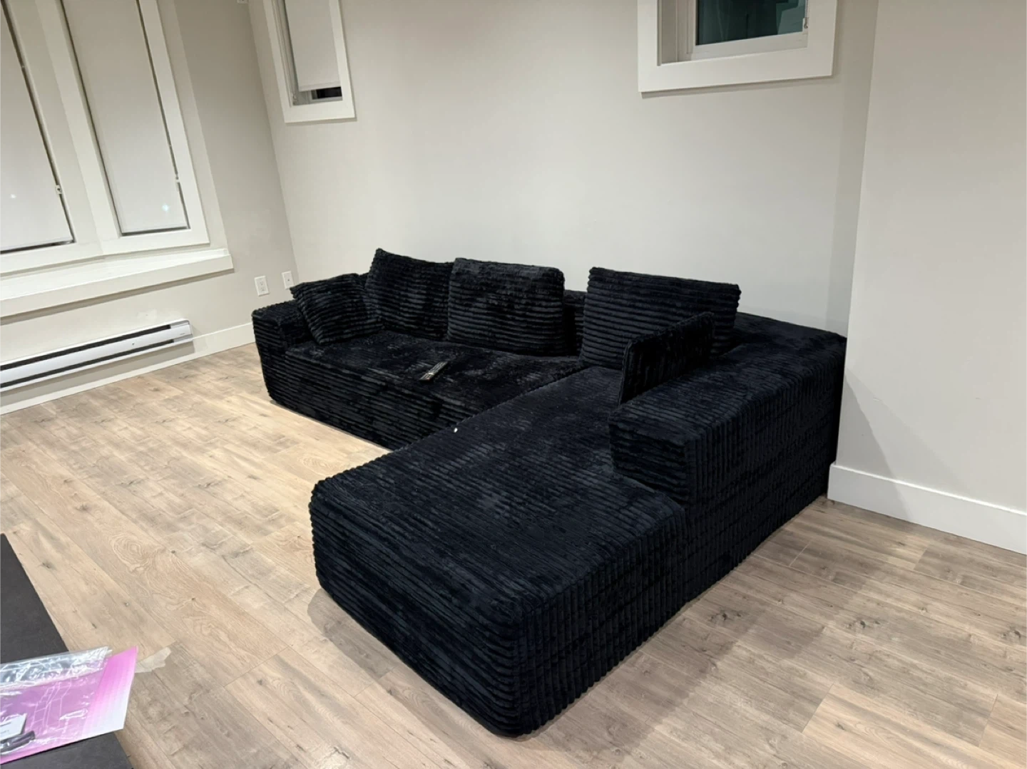 Selling a comfy corduroy sectional sofa in black colour and never been used ! It's in great shape and ready for a new living room. Perfect for relaxing and lounging after a long day