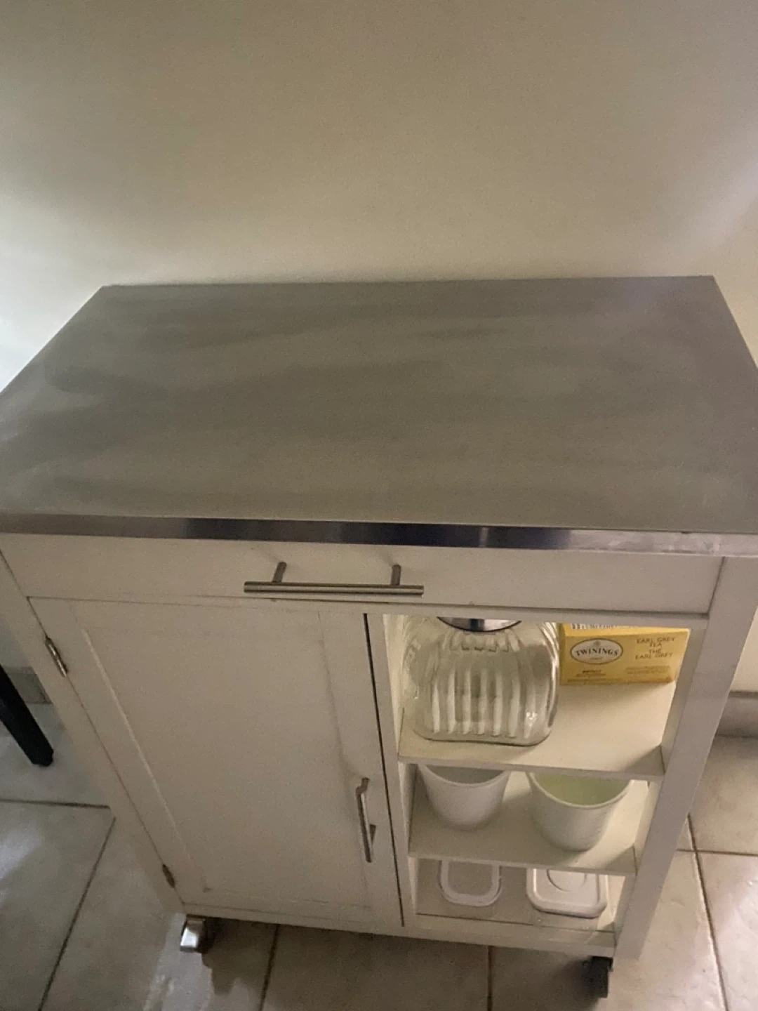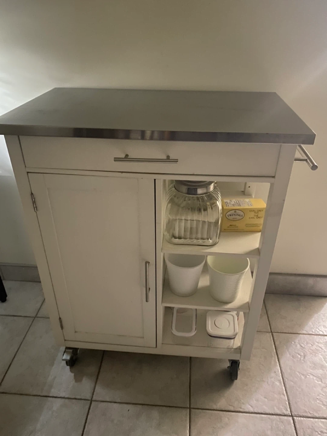 Here's a kitchen island cart with a stainless steel top and white painted wood frame. It has a cabinet and open shelves, perfect for extra storage in your kitchen or dining area. It's on wheels, so it's easy to move around as needed