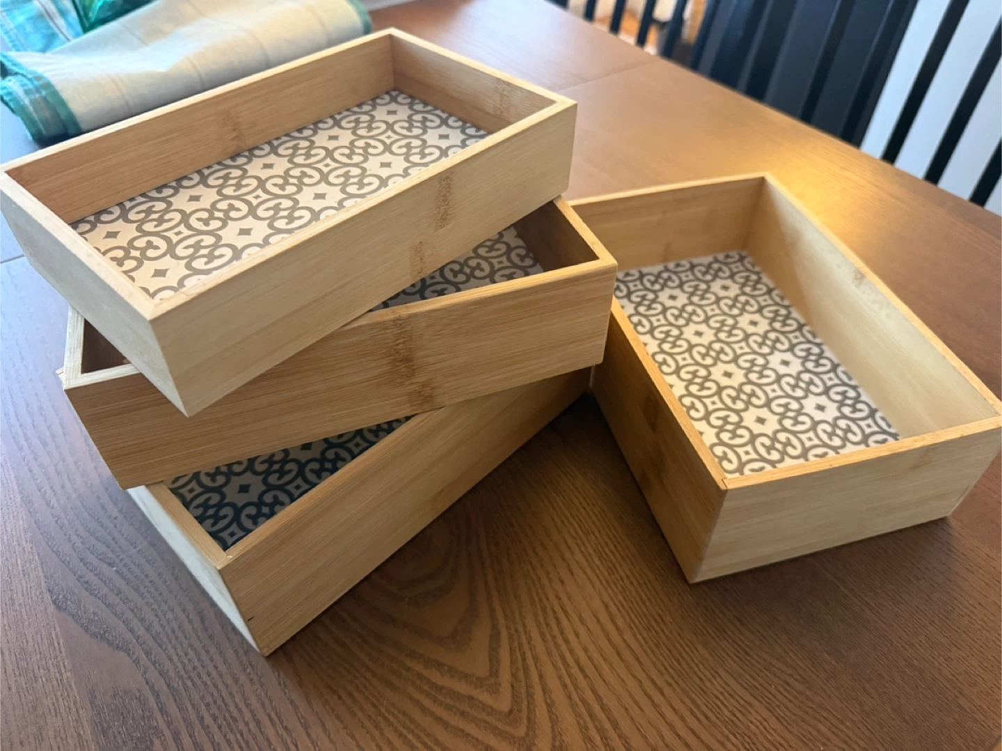 Selling a set of four bamboo storage boxes! They're in great shape and perfect for organizing small items around the house. The boxes have a nice, neutral pattern on the bottom