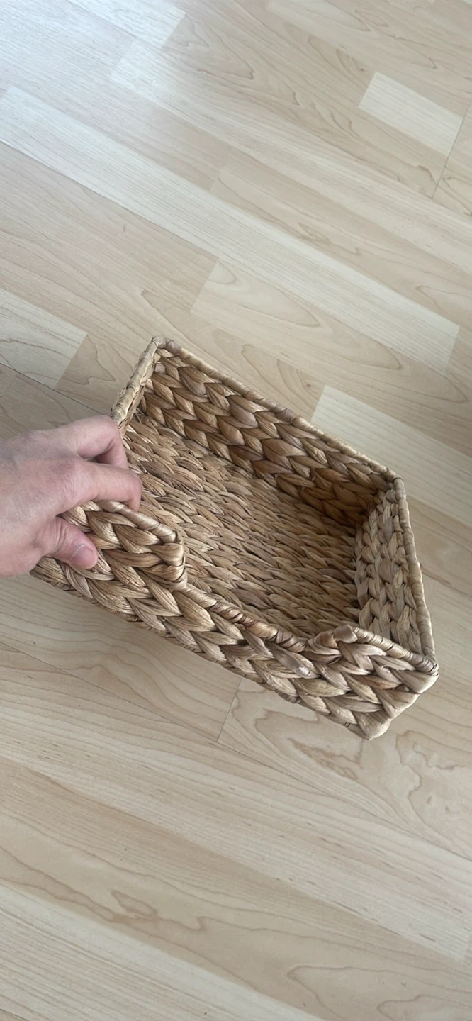 Selling a set of three woven storage baskets. They're in great shape and perfect for organizing your space! The set includes a large oval basket with handles, a medium square basket, and a small rectangular basket. They're made of a natural woven material.