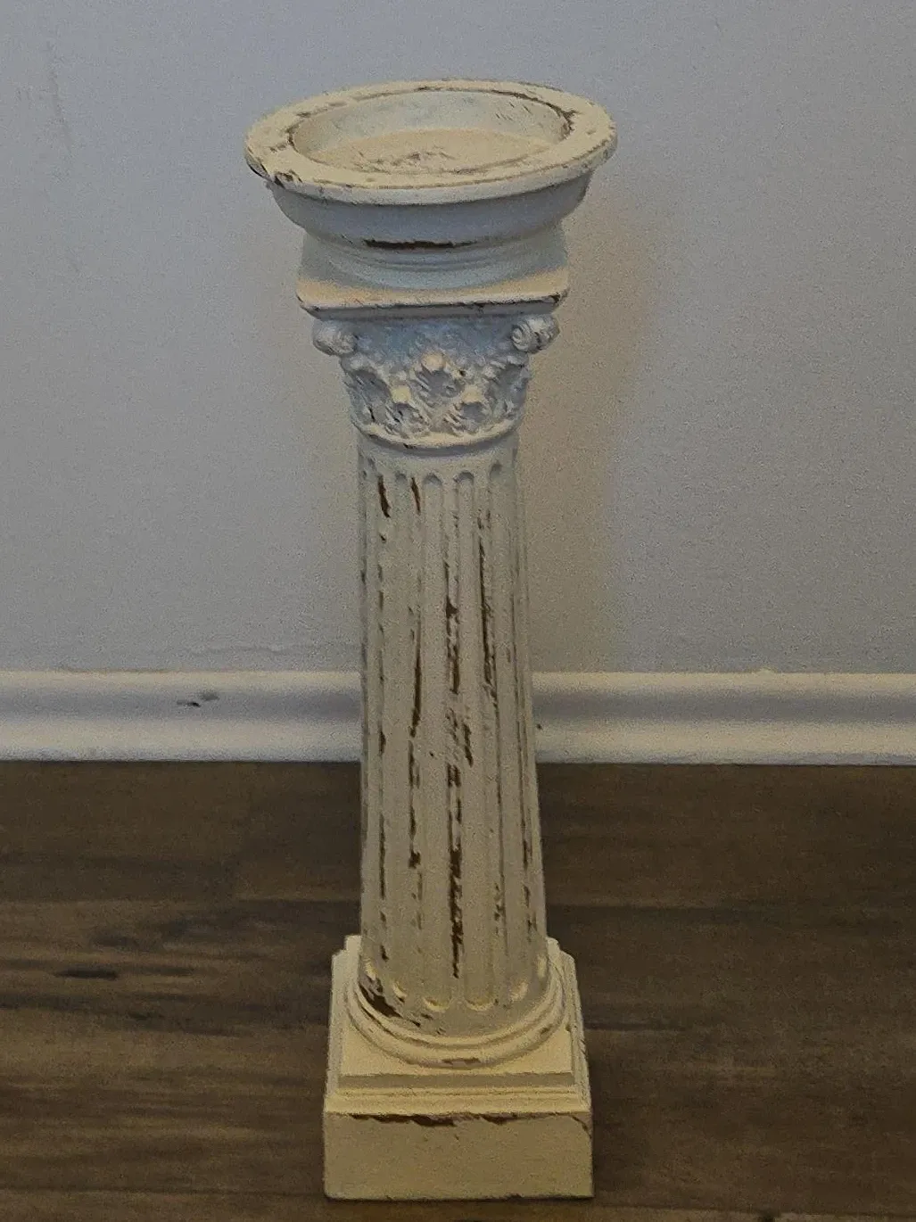 Selling a decorative white column pedestal stand. It has a distressed look, adding a vintage charm to any space. Perfect for displaying plants or decorative items in your home