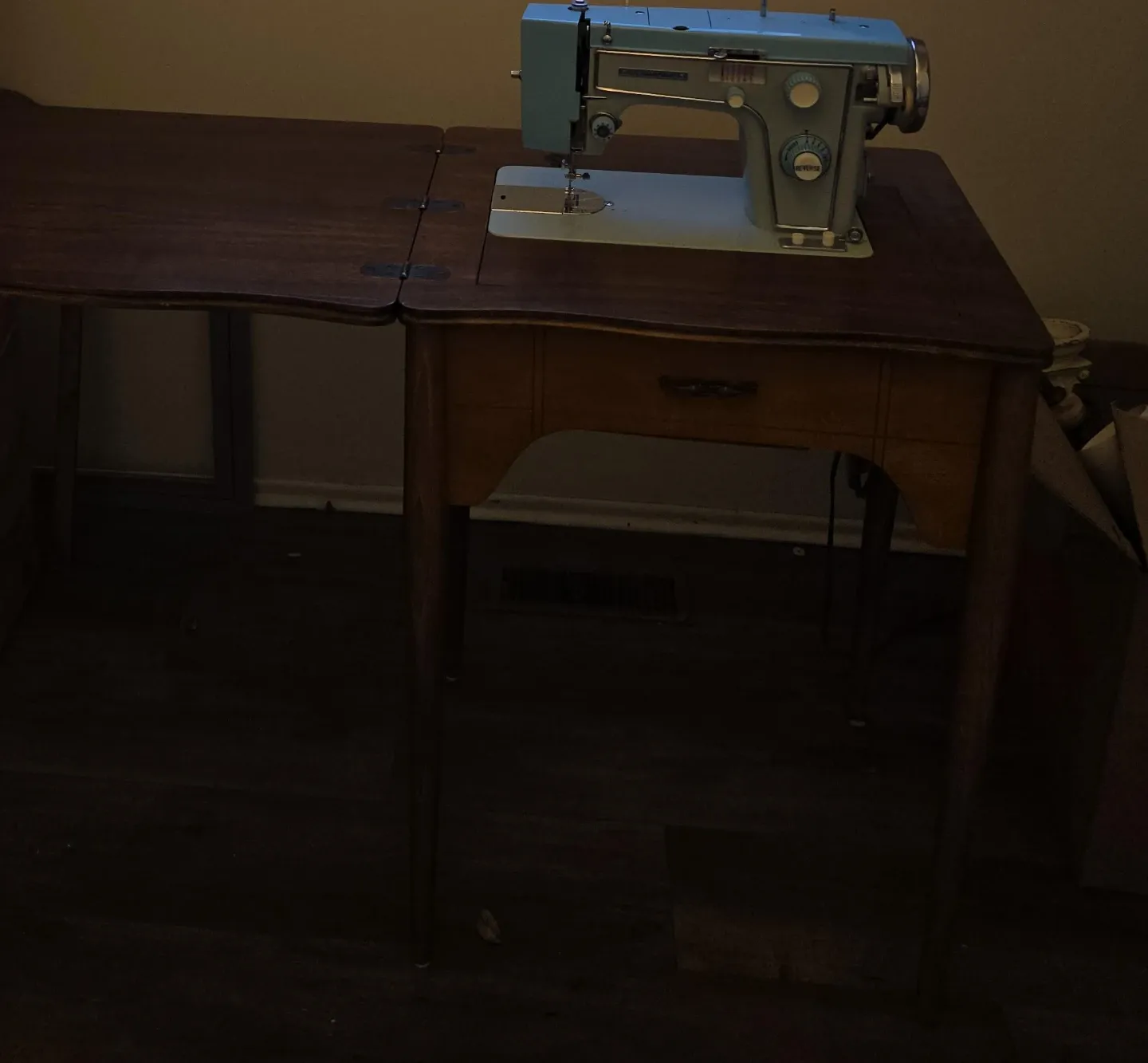 Selling a vintage sewing machine complete with its table! It's a lovely piece of functional furniture. The sewing machine is a charming light blue colour and the table has a wooden finish. It would make a great addition to any sewing room or a unique decorative piece!