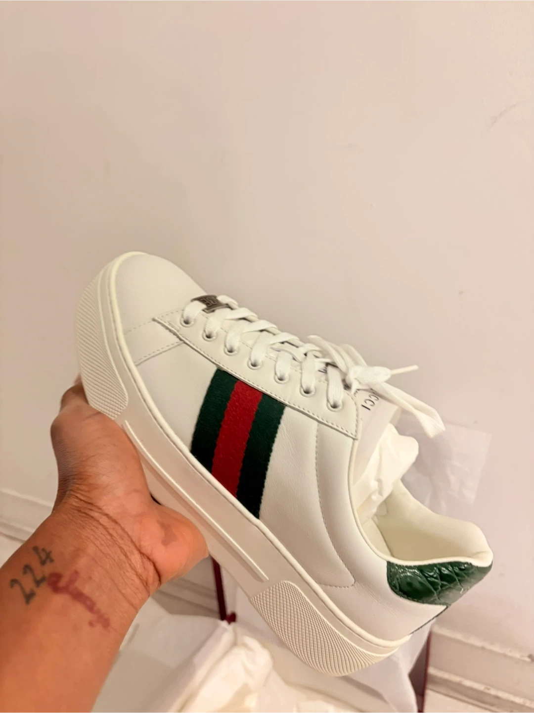 Selling a pair of authentic Gucci platform sneakers for women. They are a size 37 (European) size 7. The sneakers feature the classic green and red stripe design. Comes with the original box, dust bags, & extra laces.