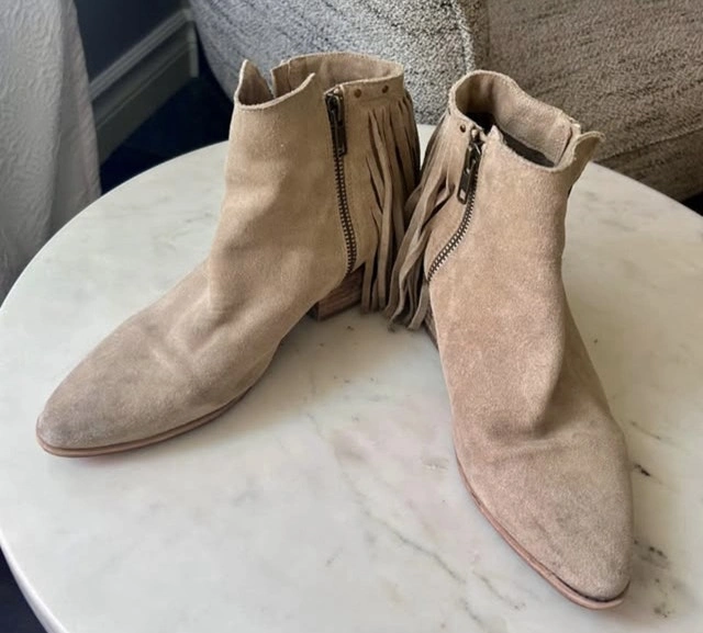 These Sam Edelman suede booties feature a stylish fringe design and a comfortable fit. Perfect for adding a touch of bohemian flair to any outfit! They show minor signs of wear but have lots of life left.