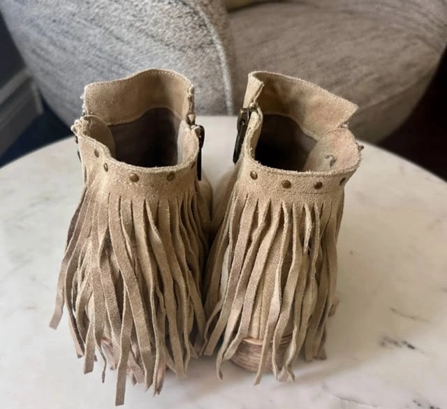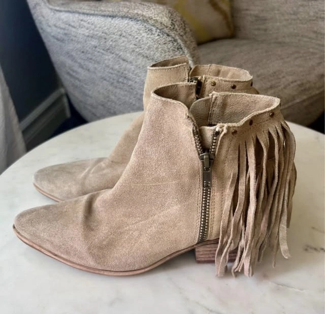 These Sam Edelman suede booties feature a stylish fringe design and a comfortable fit. Perfect for adding a touch of bohemian flair to any outfit! They show minor signs of wear but have lots of life left.