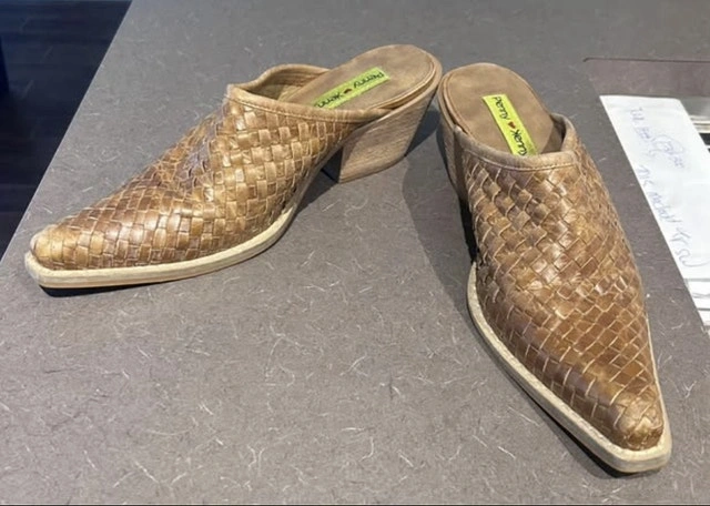 Step into style with these pre-owned leather woven mule heels, perfect for adding a touch of sophistication to any outfit. These stylish size 7.5 mules feature a chic, woven design and a comfortable heel height. In great condition and with their unique character tells a story. Key Features: Size: 7.5 Colour: Brown Design: Woven Material: Leather Style: Mule Heel Height: Comfortable height for all day wear