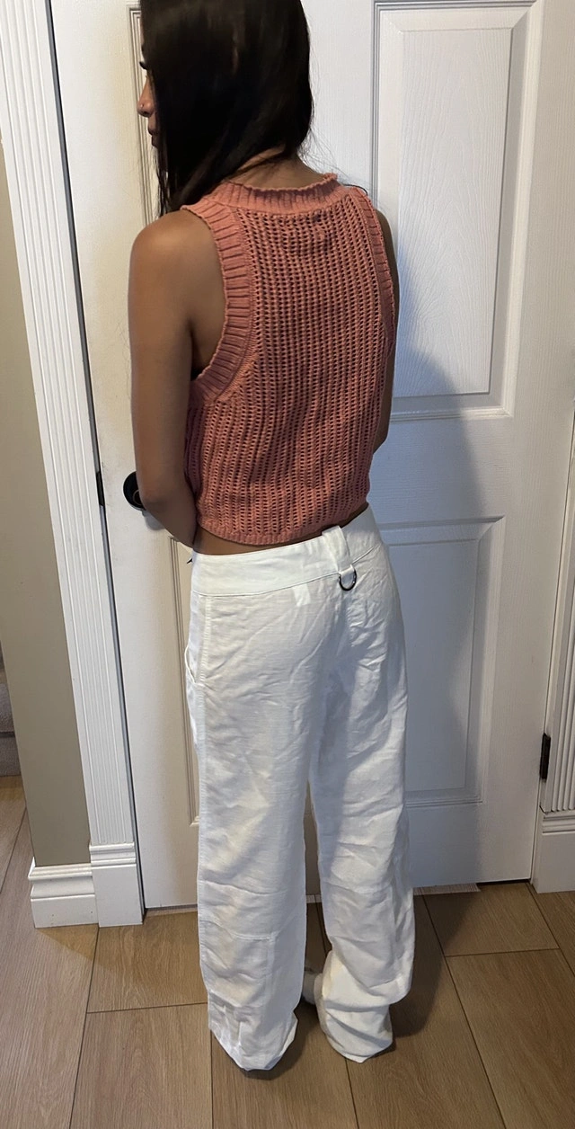 I'm selling a pair of new white linen pants, perfect for a casual yet stylish look. These pants feature a comfortable fit and unique detailing. Lower rise. Knitted top is new without tag. Whole outfit for $15 or $10 for pants and $7 for top. * Material: Linen * Colour: White * Style: Wide Leg pick up in Springbank Hill or Royal Oak
