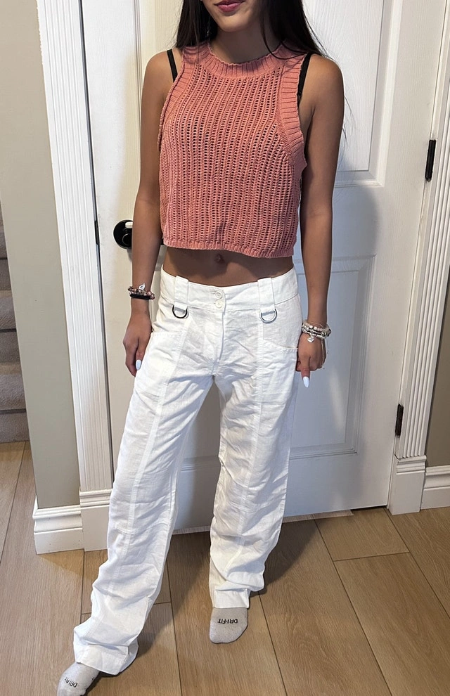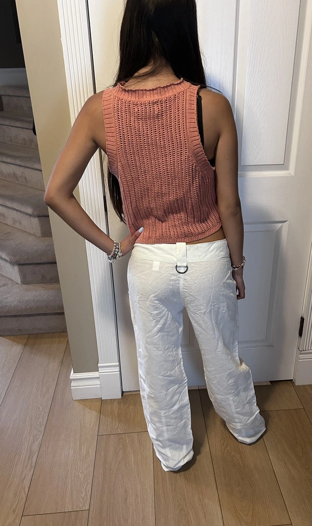 I'm selling a pair of new white linen pants, perfect for a casual yet stylish look. These pants feature a comfortable fit and unique detailing. Lower rise. Knitted top is new without tag. Whole outfit for $15 or $10 for pants and $7 for top. * Material: Linen * Colour: White * Style: Wide Leg pick up in Springbank Hill or Royal Oak