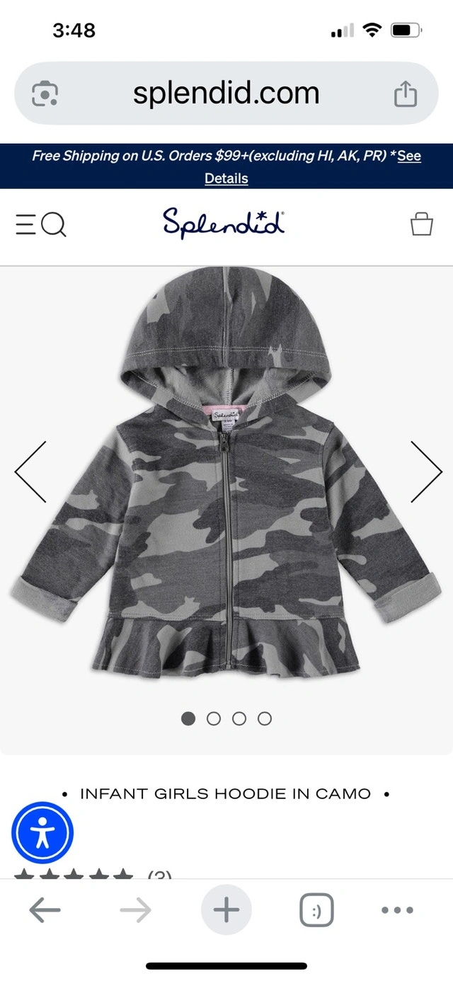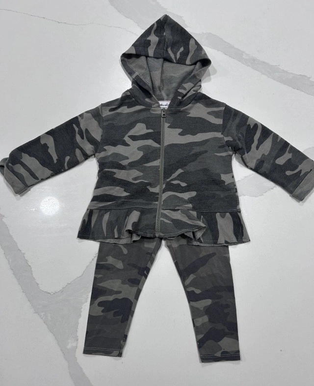 This adorable Splendid hoodie set in camo print is perfect for your little one! The set includes a zip-up hoodie with a cute ruffled hem and matching pants, both in a soft and comfortable fabric. It's in good used condition and ready for a new home. Currently still selling for $29 just the hoodie.