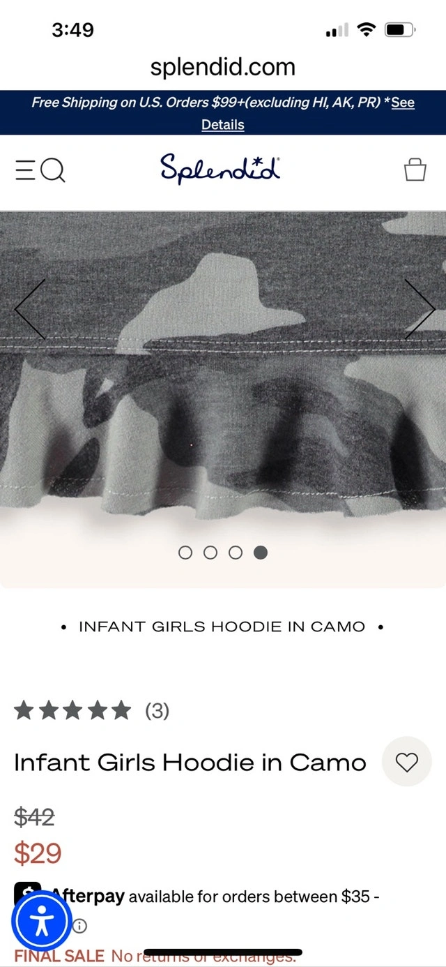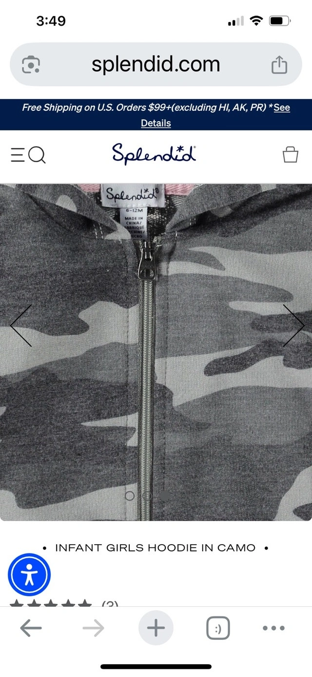 This adorable Splendid hoodie set in camo print is perfect for your little one! The set includes a zip-up hoodie with a cute ruffled hem and matching pants, both in a soft and comfortable fabric. It's in good used condition and ready for a new home. Currently still selling for $29 just the hoodie.