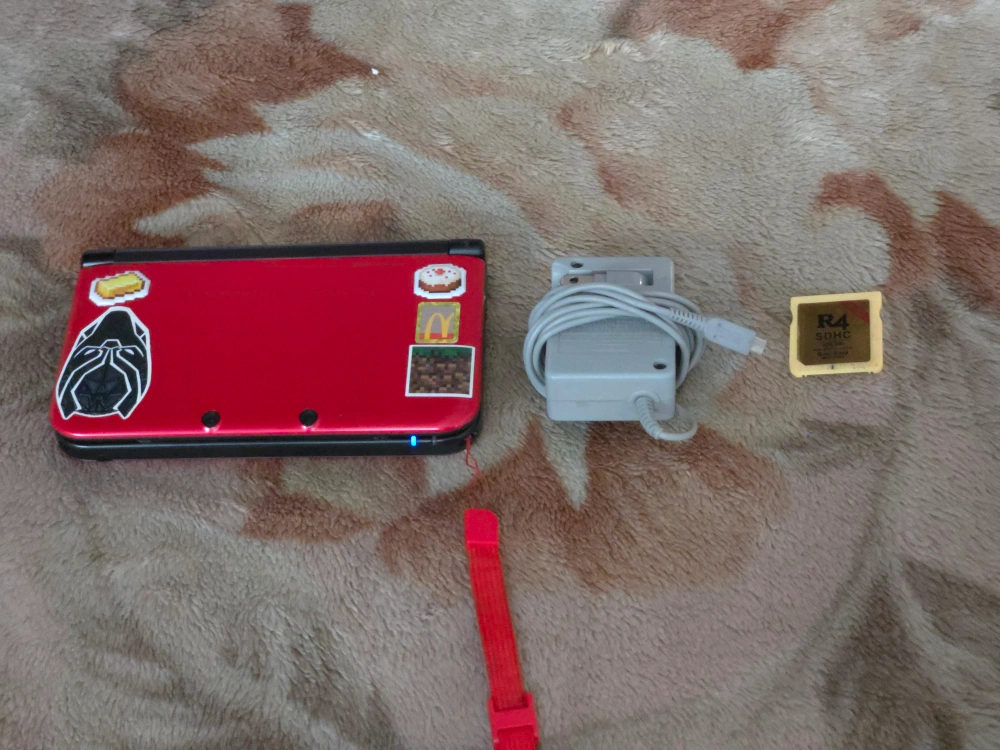 Selling a Nintendo 3DS LL in red and black. It comes with the AC adapter. There are some stickers on the back. It's also Homebrewed and comes with games.