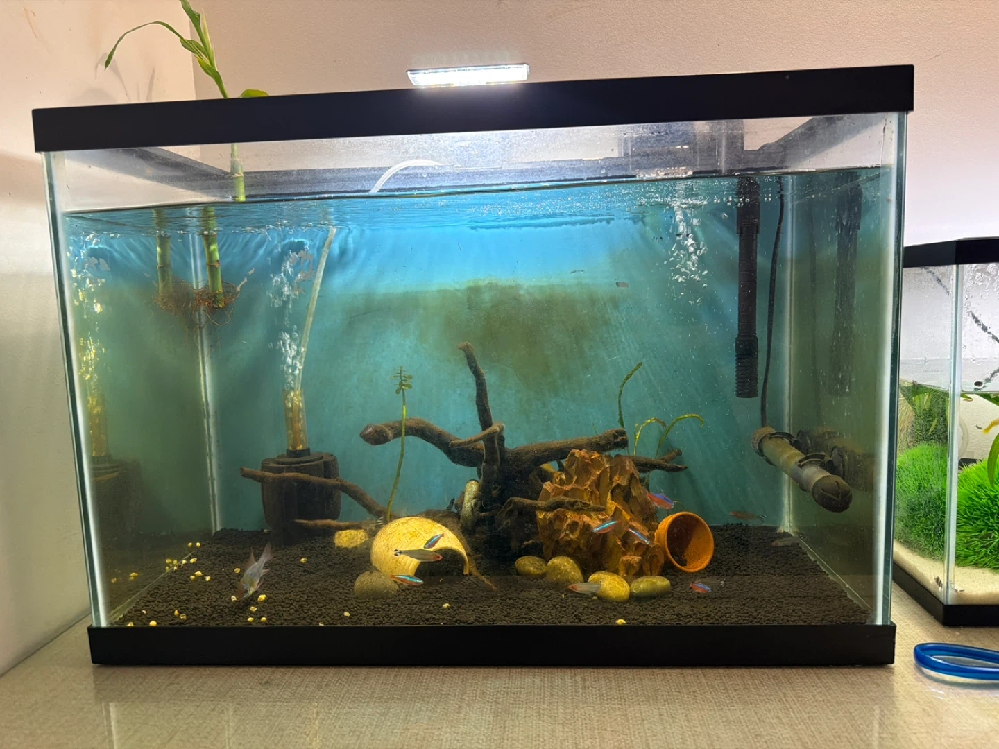 Its a moving out sale till jan 27 . 20 g aquarium with six rummy nose six beautiful cardinal tetras and a male german blue ram with air-pump heater, filter, fish net food and all light and a plant substrate is soil fluval . There is cave , stone and drift wood too.It’s perfect for whole setup and ready for new home.