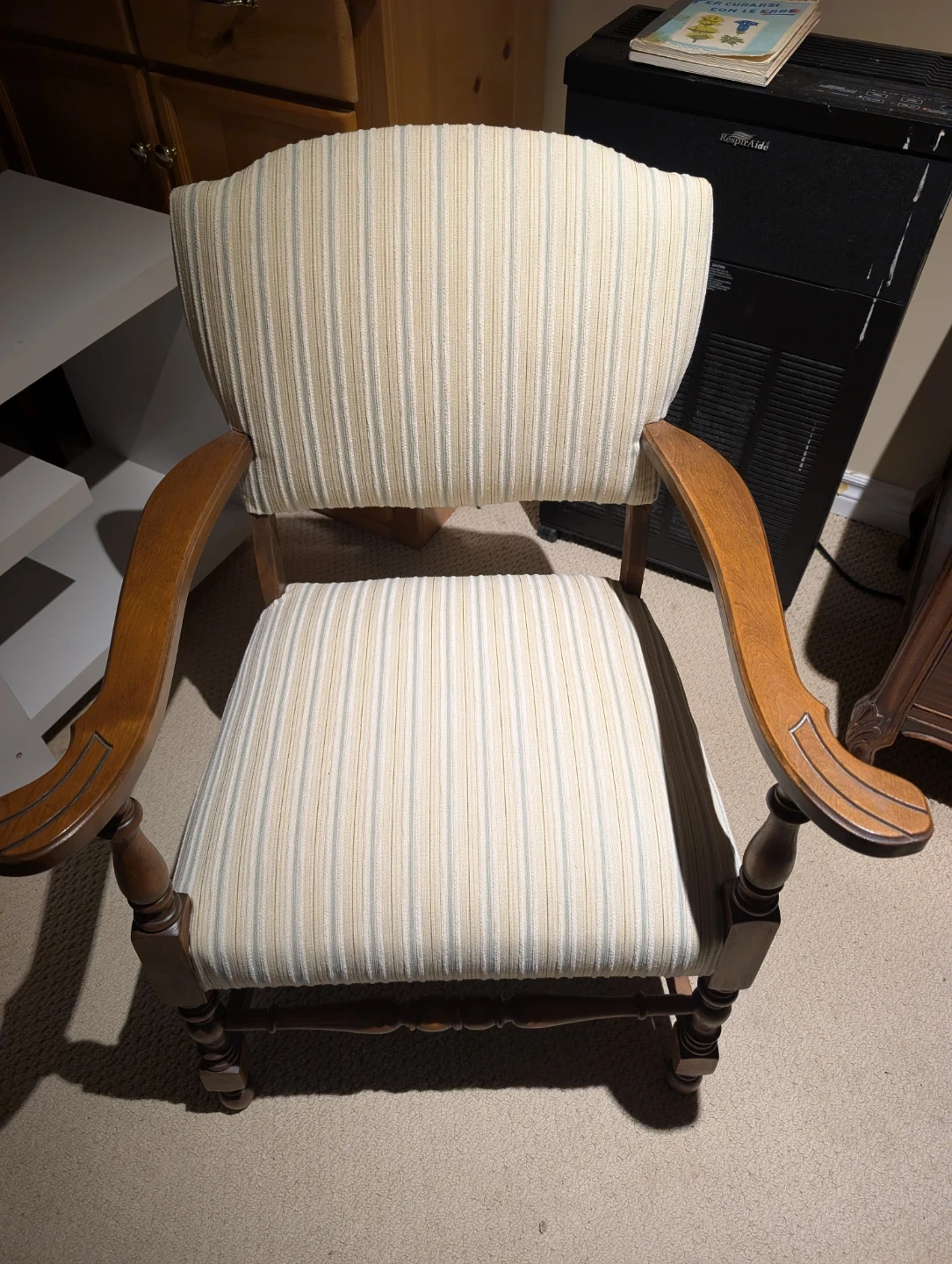 Selling a lovely vintage armchair! It features a striped fabric seat and back, with wooden armrests and legs. It's in great condition and would be a charming addition to any room