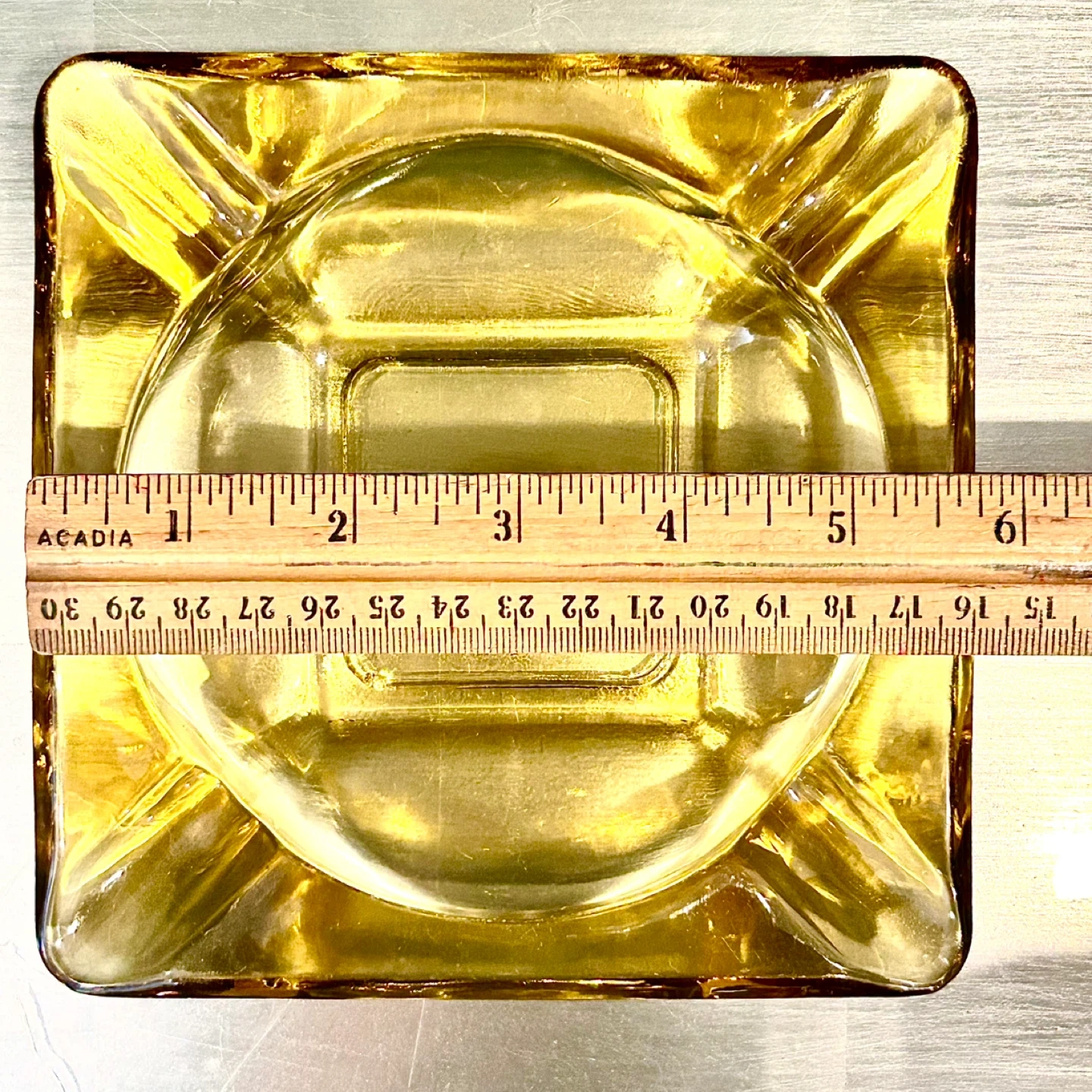 Likely produced in the 1950s-1960s, this exceptionally heavy amber art glass bowl exemplifies the modernist European glass movement of the mid-century period. The form is architectural and deliberate: a thick square outer frame with softened corners surrounding a raised oval basin, executed in richly saturated amber glass with strong optical depth.