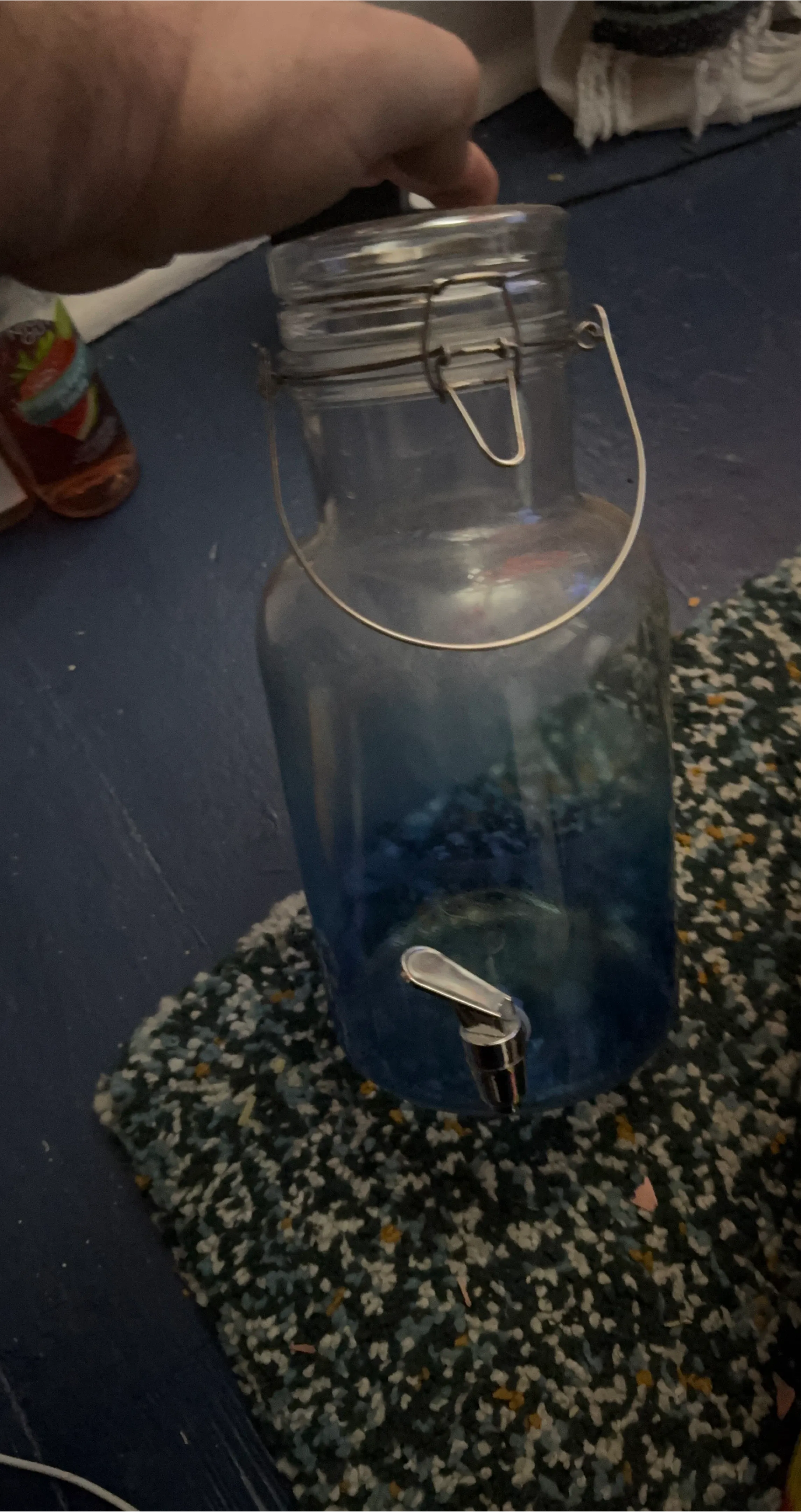 Here's a glass beverage dispenser, perfect for parties or everyday use! It features a spigot for easy serving and a secure lid to keep your drinks fresh. The dispenser has a blue tint at the bottom, adding a stylish touch