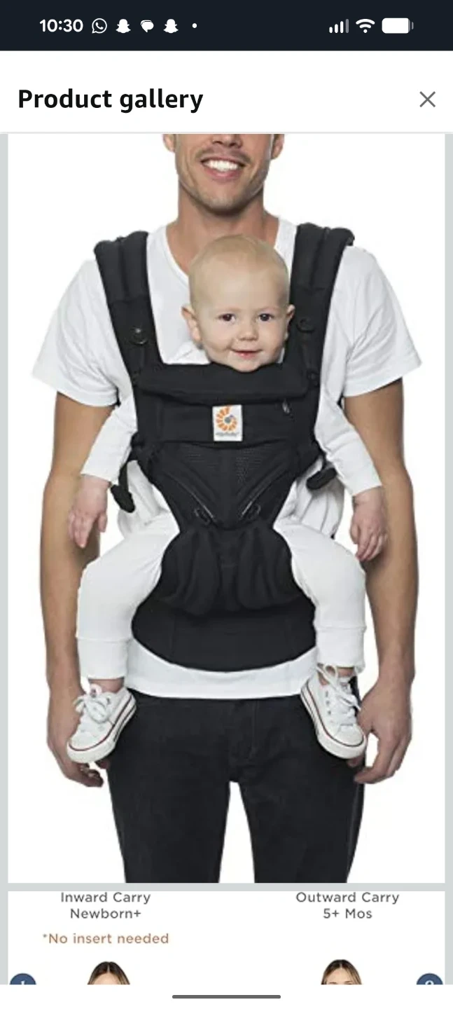 Ergobaby 360° carrier in black! This carrier is great for keeping your little one close while you're on the go. Can wear front or back. Its very soft unlike other carriers, and features a cotton fabric for breathability and is designed for less back pain. The baby loves it and fell right asleep. Has a little pouch for storing stuff and if easily adjusted. Perfect for inward carry for newborns and outward carry for 5+ month olds. You deserve a little hands free time.