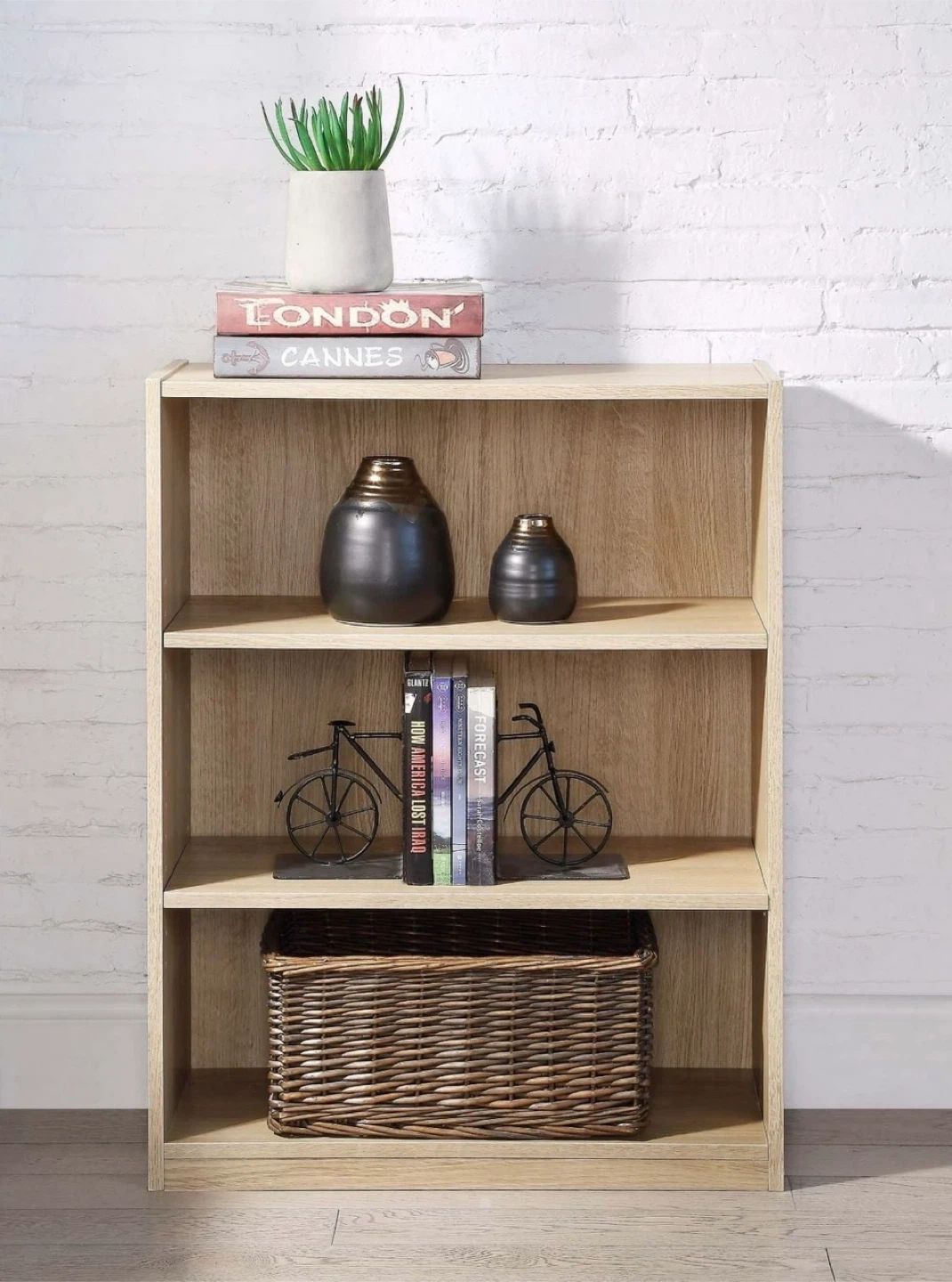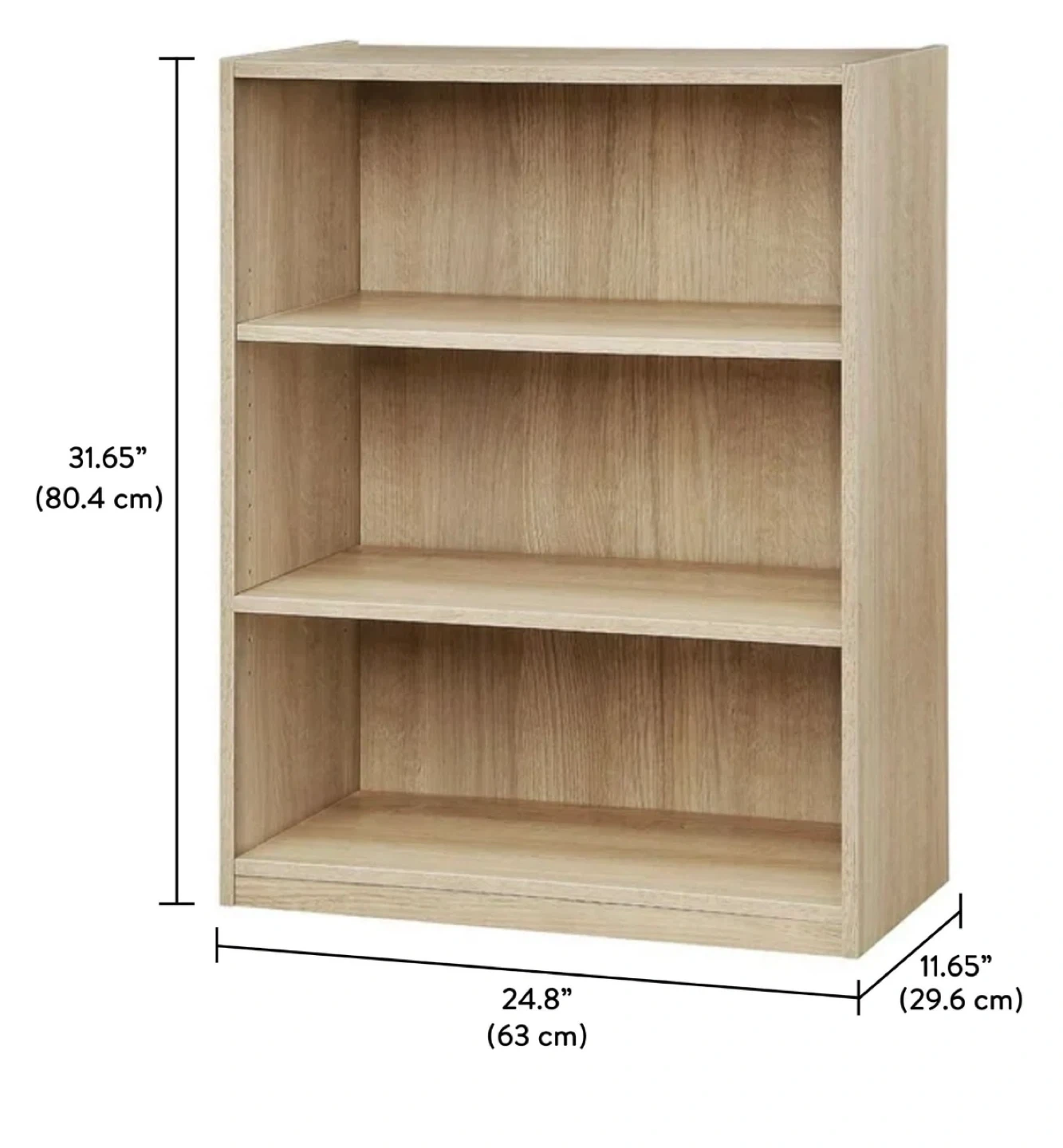 Here's a simple 3-shelf bookcase, perfect for adding some storage to any room. It has a nice oak finish.