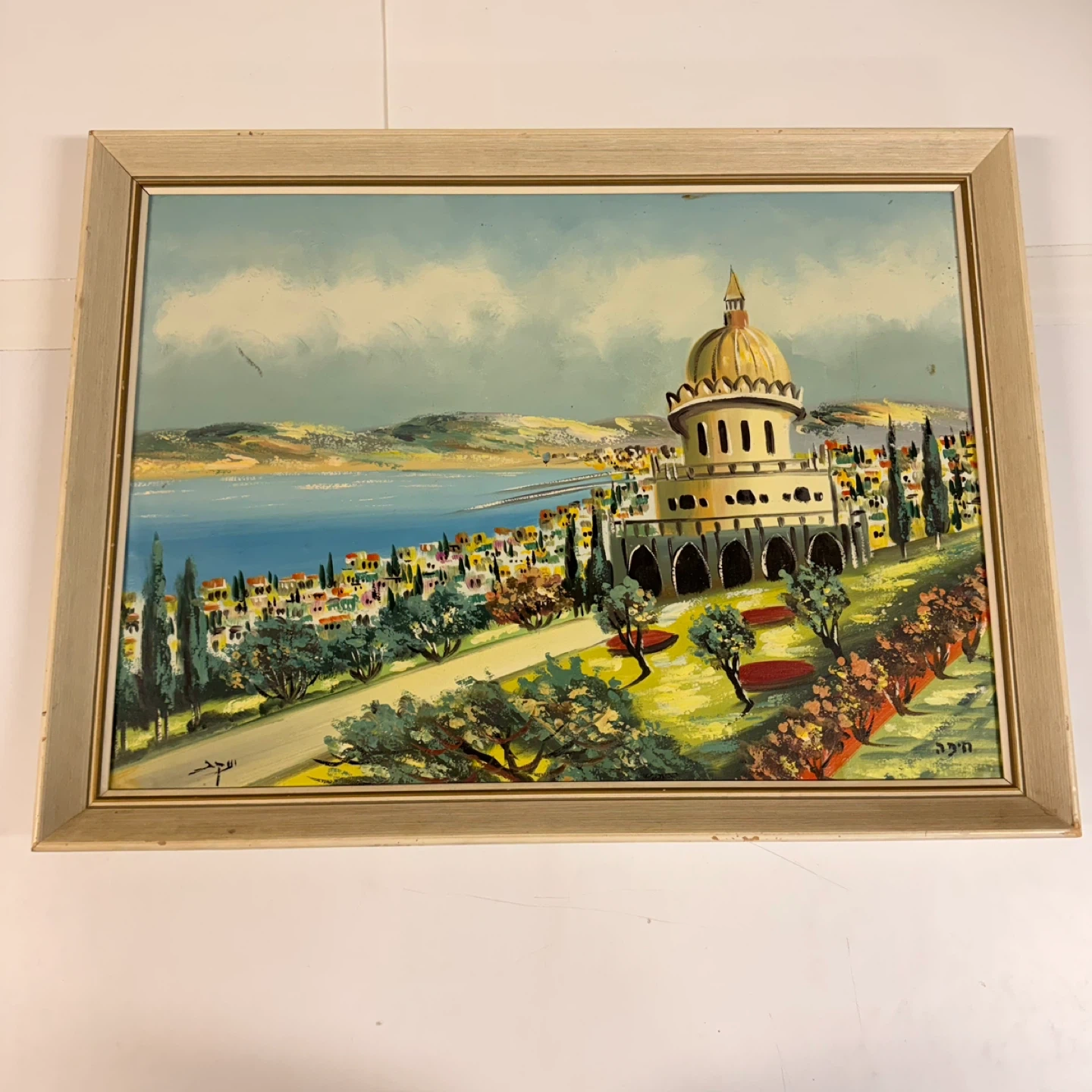 Original vintage hand-painted landscape artwork featuring a Mediterranean coastal city with a domed building, trees, and hillside scenery.