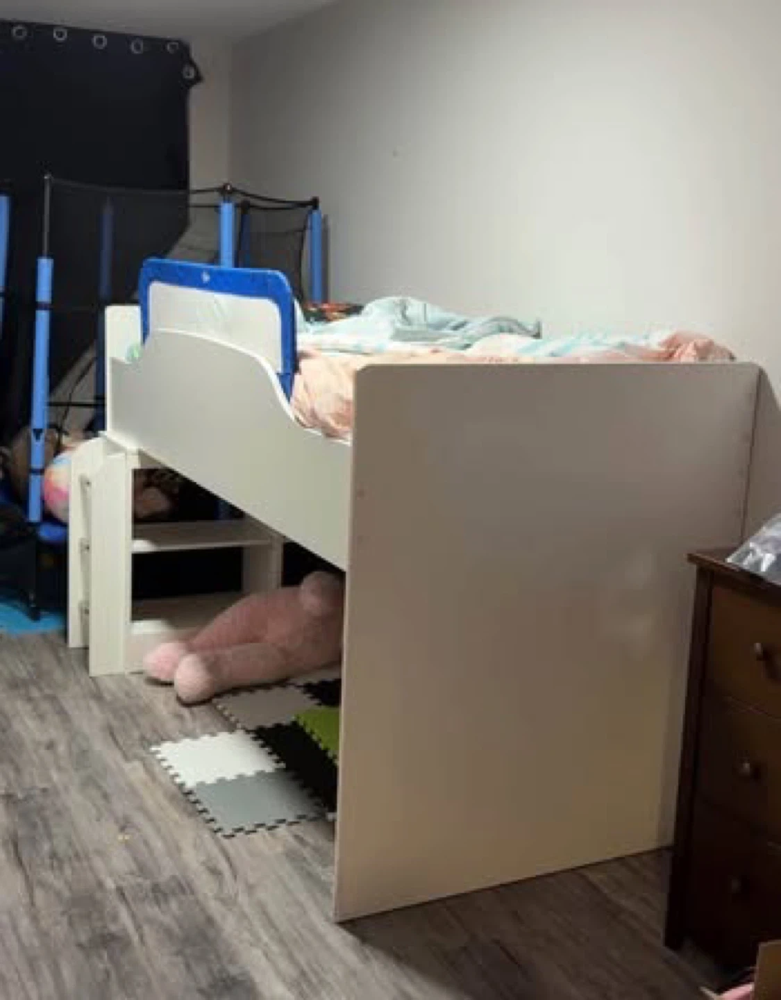 Selling a cute white loft bed for kids! It's in great shape and has handy storage built in underneath. Perfect for saving space in a smaller room and adding a fun touch to any kid's bedroom