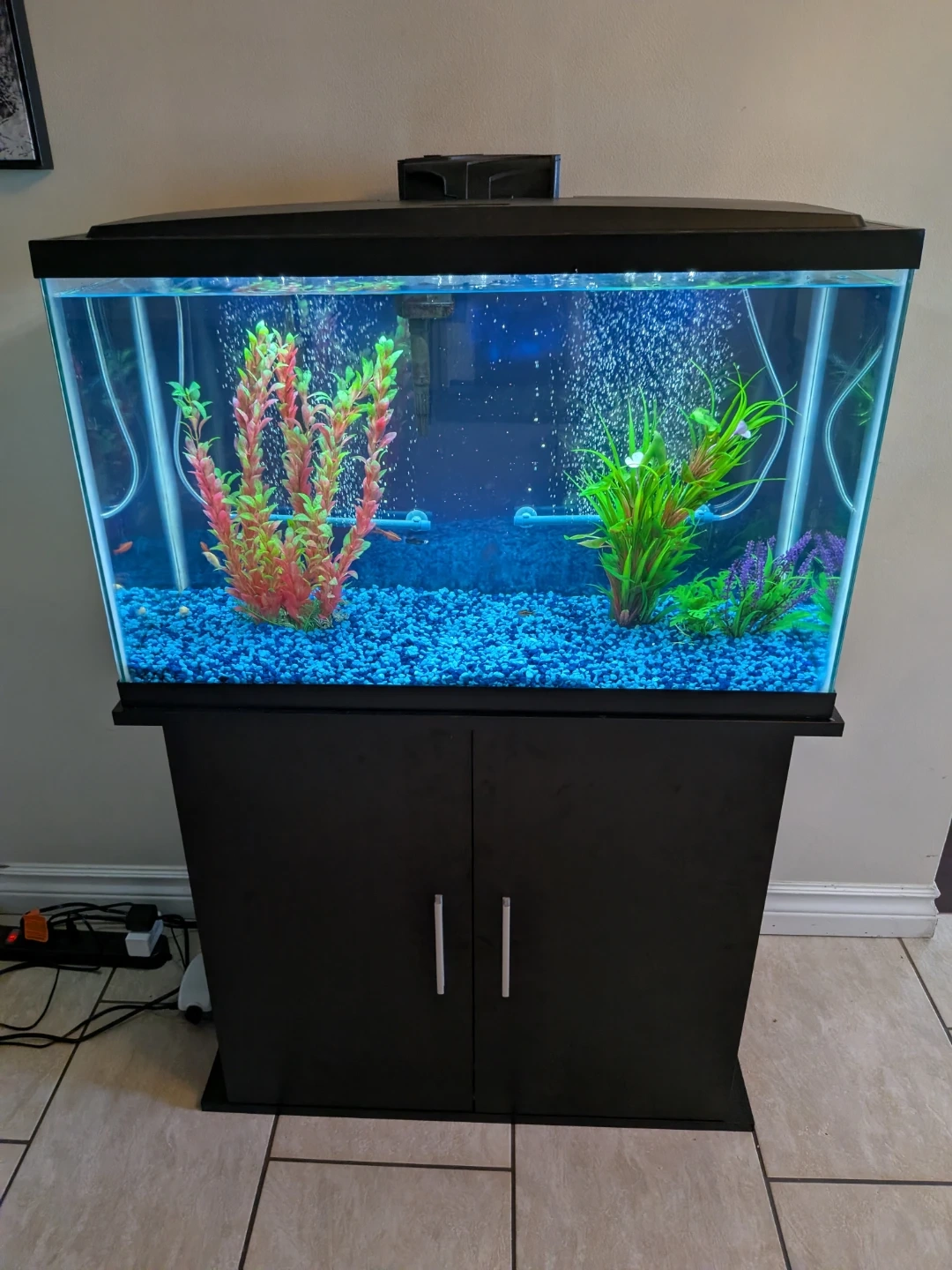 29 gallon Fish Tank with black cabinet and fish for sale. Blue Rocks in the fish tank and everything in the cabinet you can see in the pictures comes with it as well. Located in Brantford.