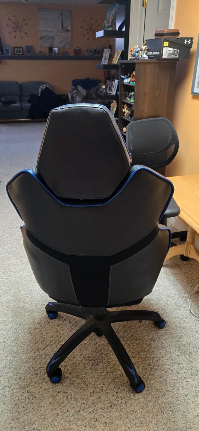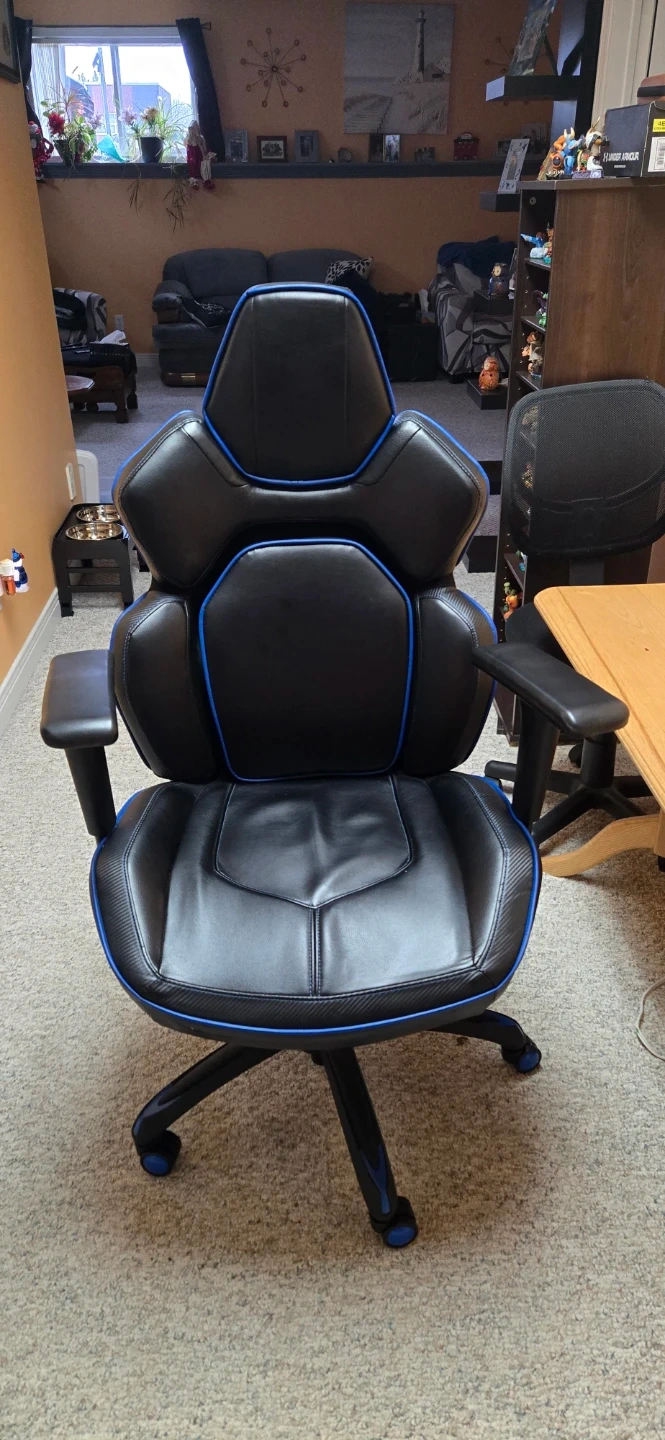 Selling a gaming chair in great condition! It's black with blue trim, and has a comfortable, ergonomic design. Perfect for long gaming sessions or working from home