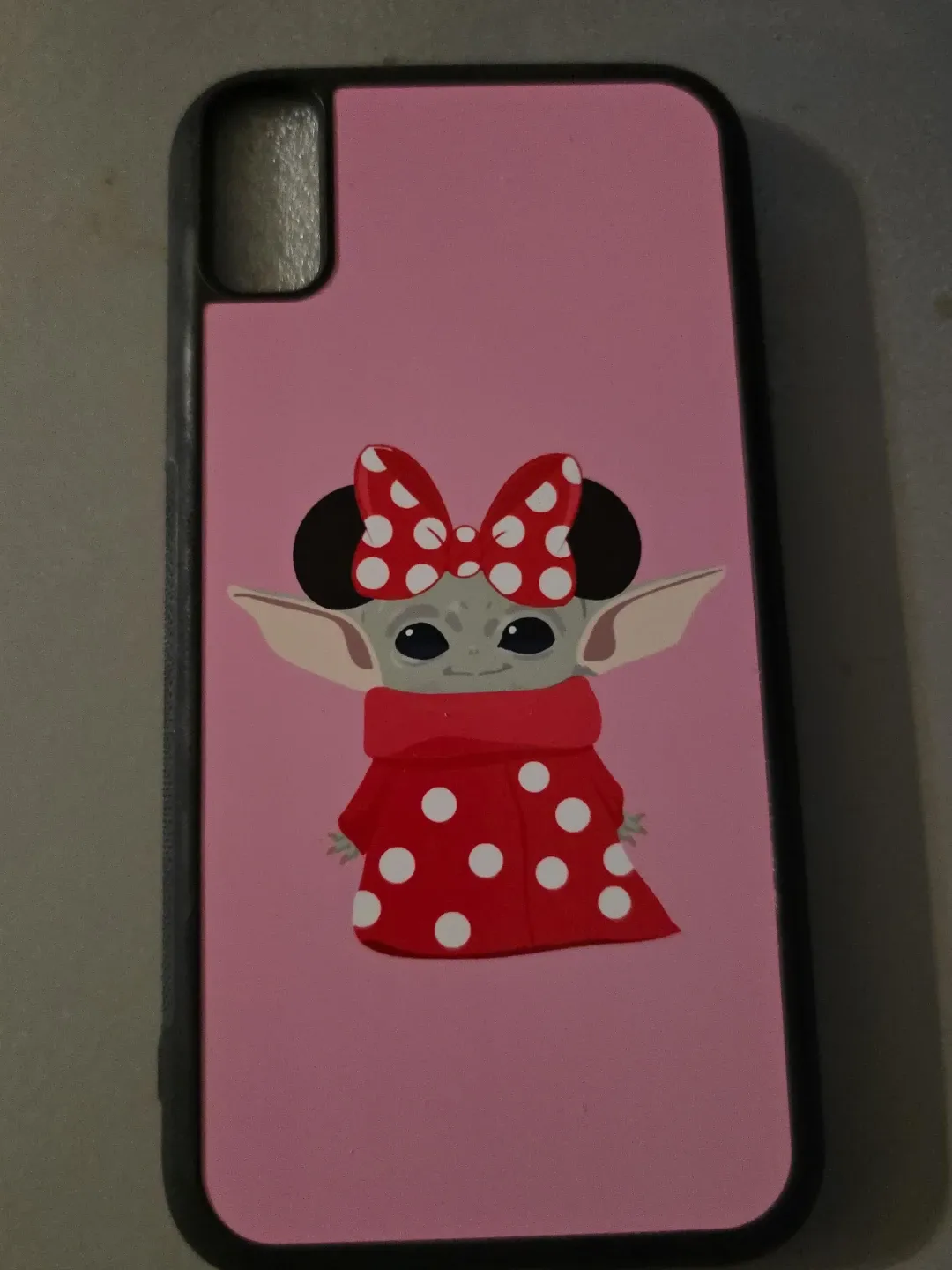 Selling a cute iphone xr case featuring Baby Yoda dressed as Minnie Mouse! It's pink with a black trim and in great condition. Perfect for any Star Wars or Disney fan