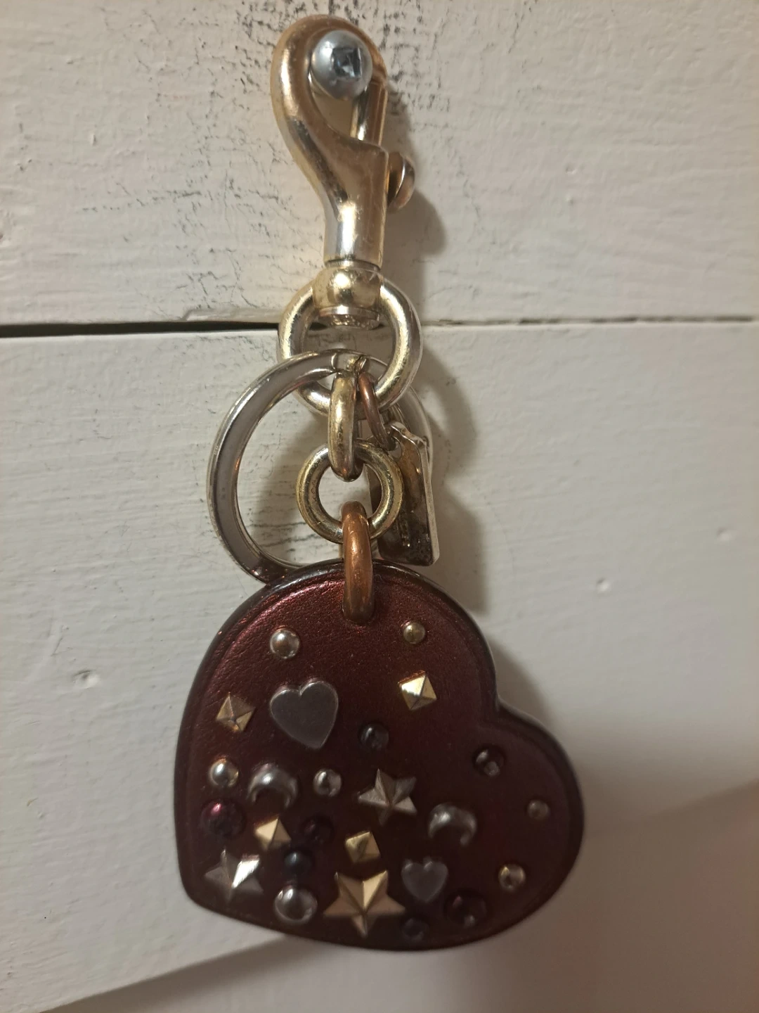 A cute Coach heart keychain to add some charm to your keys or bag! It features a heart-shaped design with decorative studs and a sturdy clip for easy attachment.