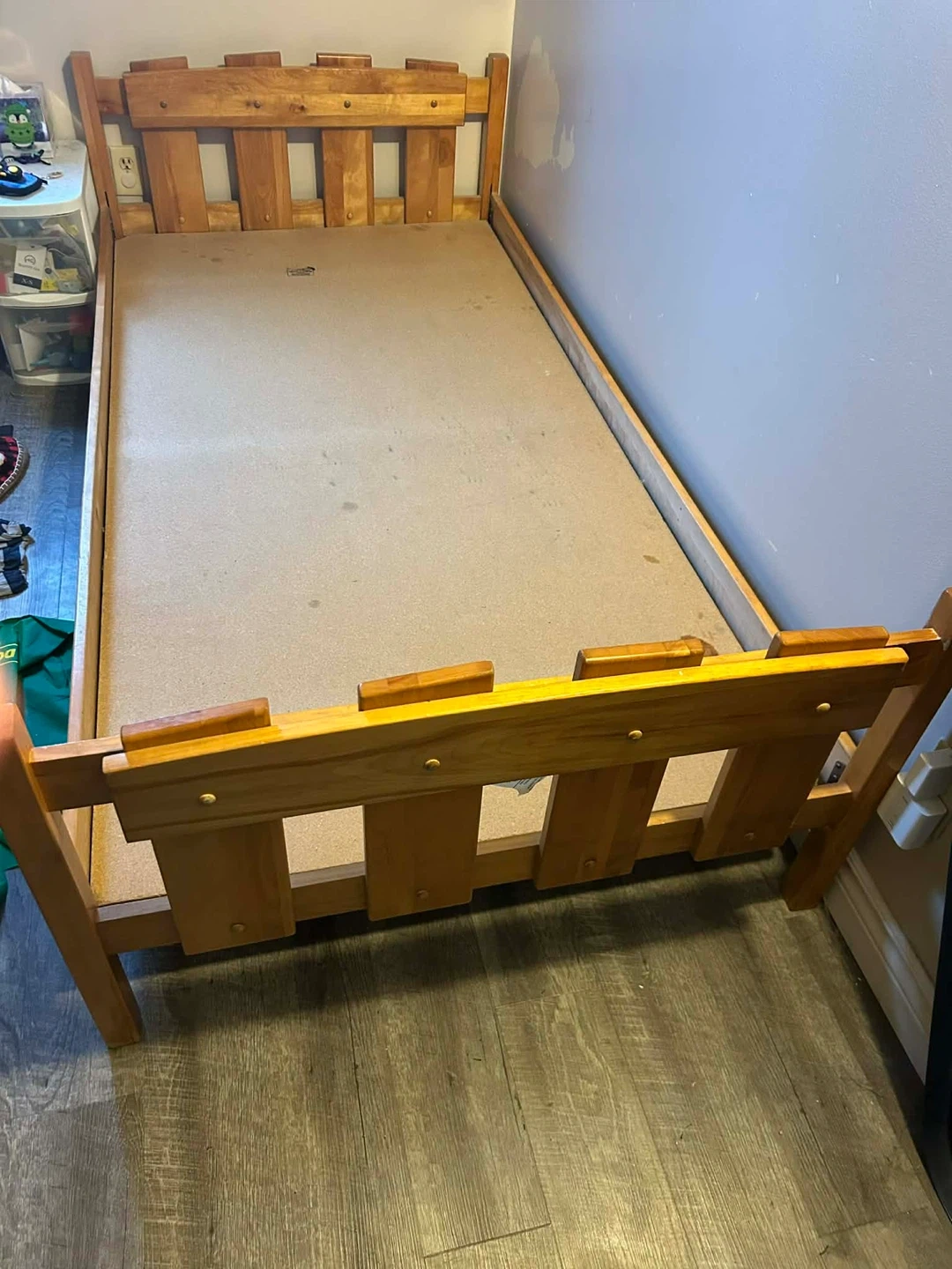 Selling a wooden single bed frame. It's in good condition and ready for a new home! Perfect for a kid's room or a guest room